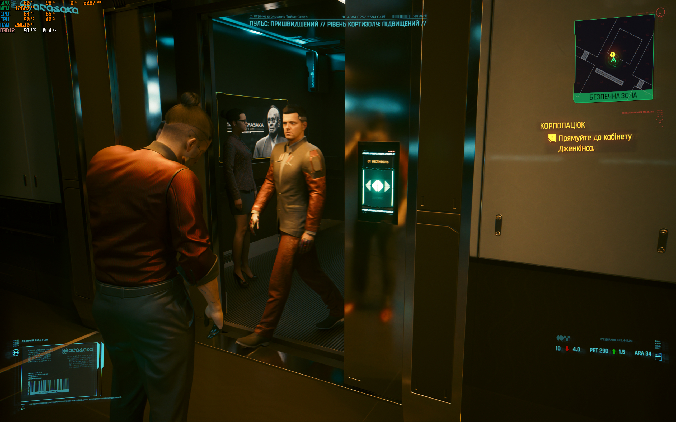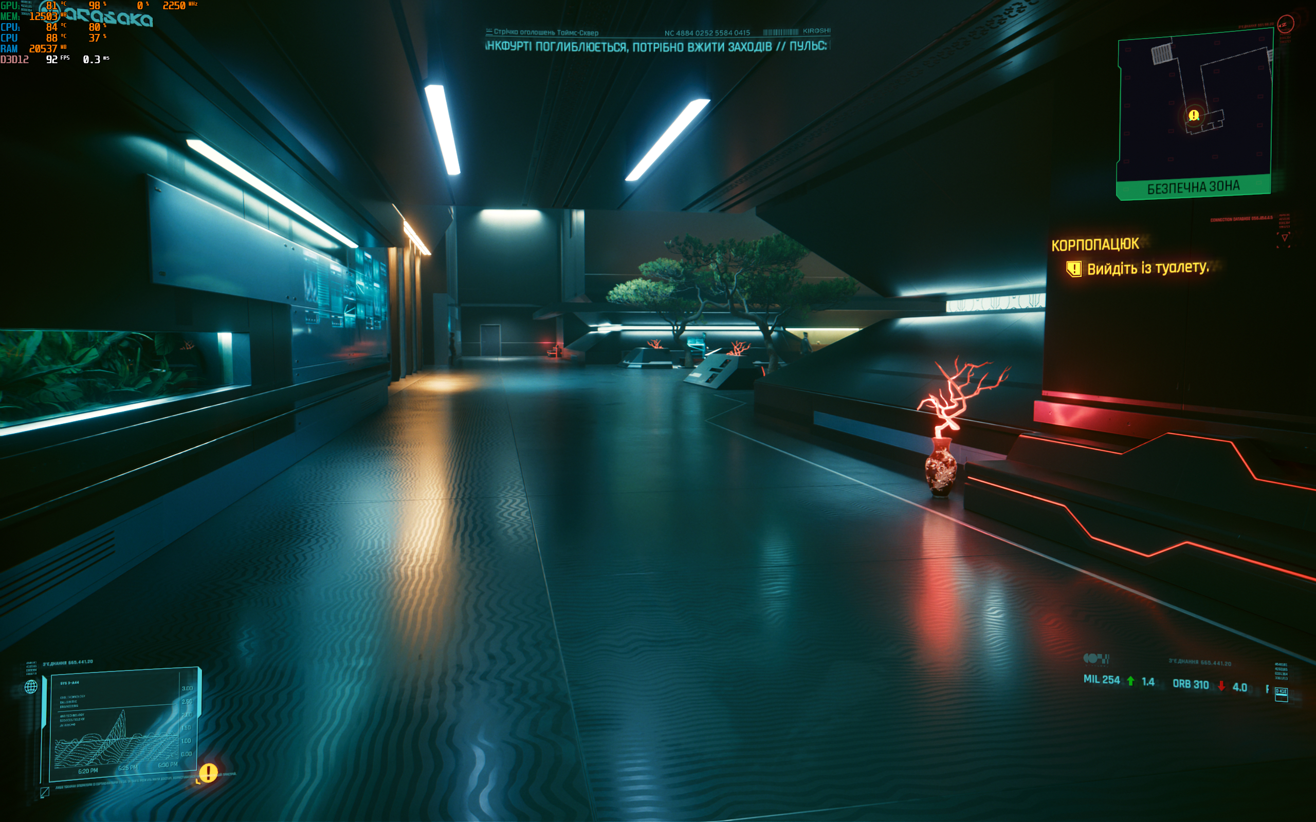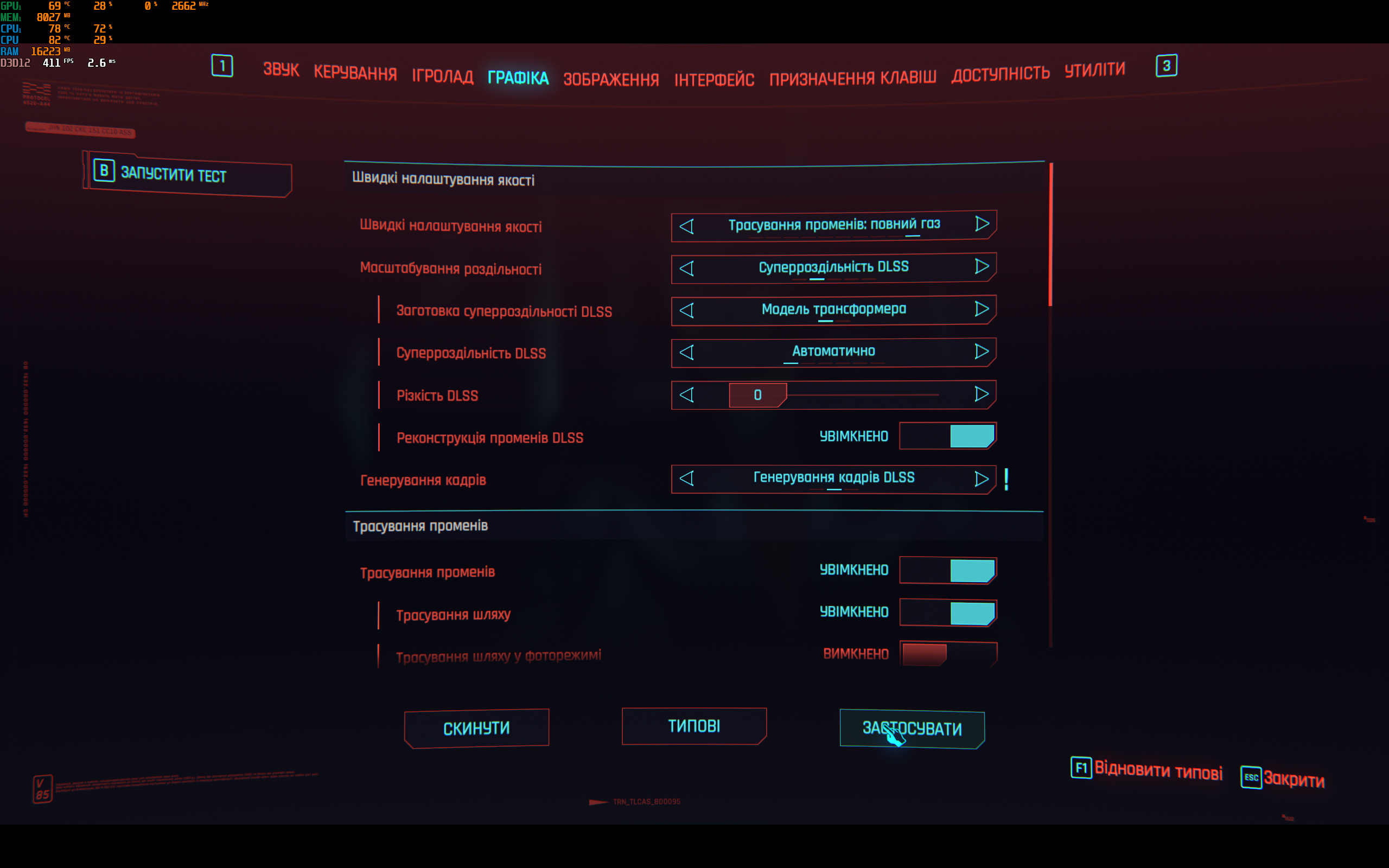 - Cyberpunk 2077. Максимальні налаштування, включно з трасуванням шляху. DLSS у автоматичному режимі з генеруванням кадрів. 90-100 FPS