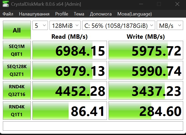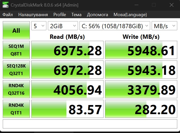 Накопичувач має цілком очікувану високу швидкість роботи. До 7100 МБ/с під час зчитування даних, та близько 5200 МБ/с при записі.
