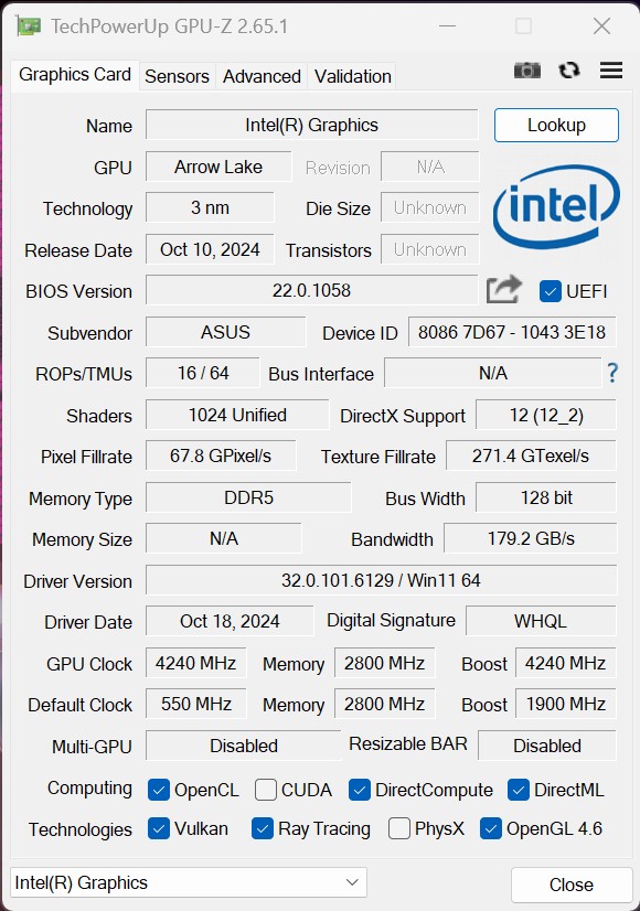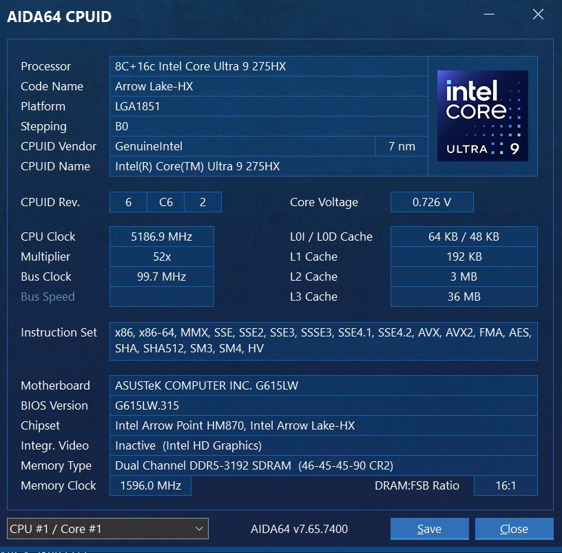 ASUS ROG Strix G16 (2025) отримав дуже продуктивні сучасні компоненти, близькі до максимально можливих на сьогоднішній день. У якості процесора використовується флагманський 24-ядерний Intel Core Ultra 9 275HX сімейства Arrow Lake, що виробляється за TSMC N3B техпроцесом. Він включає в себе 8 продуктивних ядер до 5,4 ГГц, 16 енергоефективних ядер до 4,6 ГГц та блок Intel AI Boost NPU 13 TOPS. 36 МБ кеш. Базовий рівень TDP — 55 Вт, Boost — до 80 Вт у даному випадку. Вбудований графічний прискорювач Intel Graphics має 8 ядер, частота до 1.9 ГГц. Оперативна пам'ять — 64 ГБ DDR5 5600 (2х32 ГБ), працює в двоканальному режимі. Бездротові інтерфейси: Bluetooth 5.4 та швидкий Wi-Fi 7(802.11be) (потрійний діапазон) 2х2. У якості дискретного відеоприскорювача використовується топова NVIDIA GeForce RTX 5080 Laptop. TGP: до 175 Вт (150 Вт+25 Вт Dynamic Boost). Частота — до 1500 МГц та буст до 1550 МГц. Об'єм відеопам'яті 16 ГБ GDDR7. Ноутбук оснащений мультиплексором MUX Switch для прямого підключення відеокарти до дисплея для зменшення затримки та збільшення продуктивності. Підтримується технологія NVIDIA Advanced Optimus для автоматичного перемикання MUX Switch.
