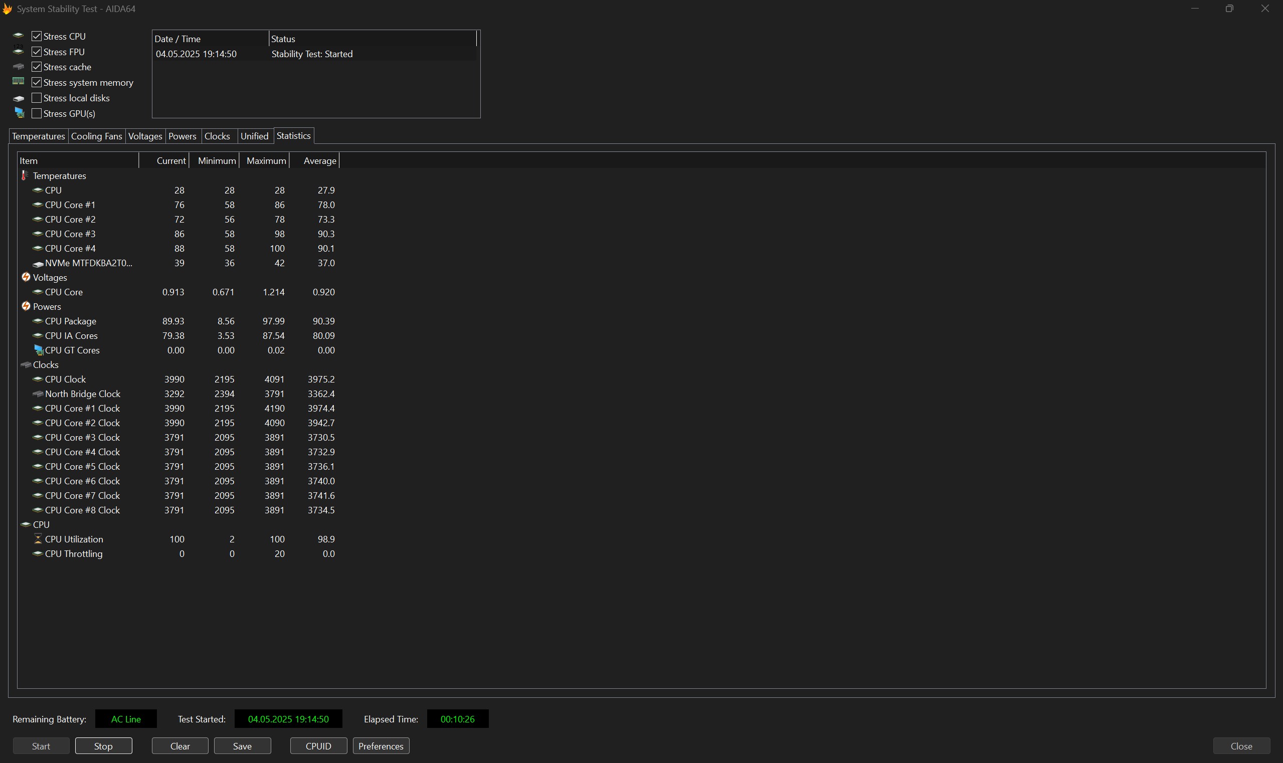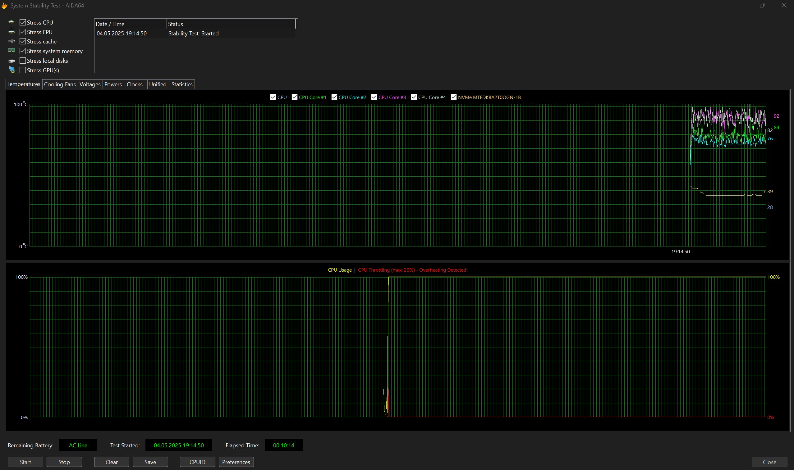 Стрес-тест AIDA64 показав, що при максимальному навантаженні процесор спочатку гріється до 100°, а далі тримає в середньому 90° і працює стабільно. Але схоже, що поки AIDA64 не зовсім коректно працює з новим залізом. Адже у статистиці вказано максимальний тротлінг 20%, при цьому середнє значення — 0%, що неможливо. Тож варто дочекатись оновлення. У будь якому разі, за час використання проблем зі стабільністю не було. Звісно, при максимальних навантаженнях СО працює досить голосно. Але у розумних межах. При мінімальному навантаженні її зовсім не чутно.