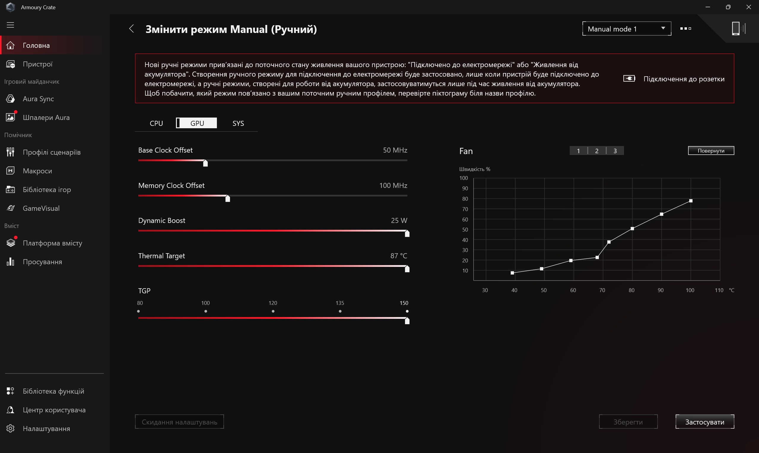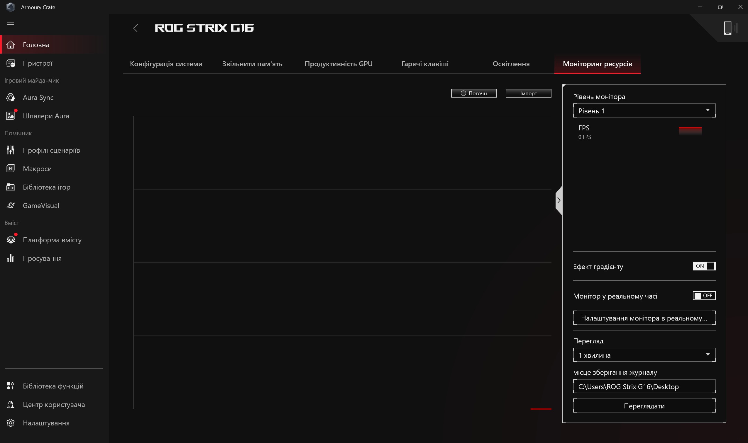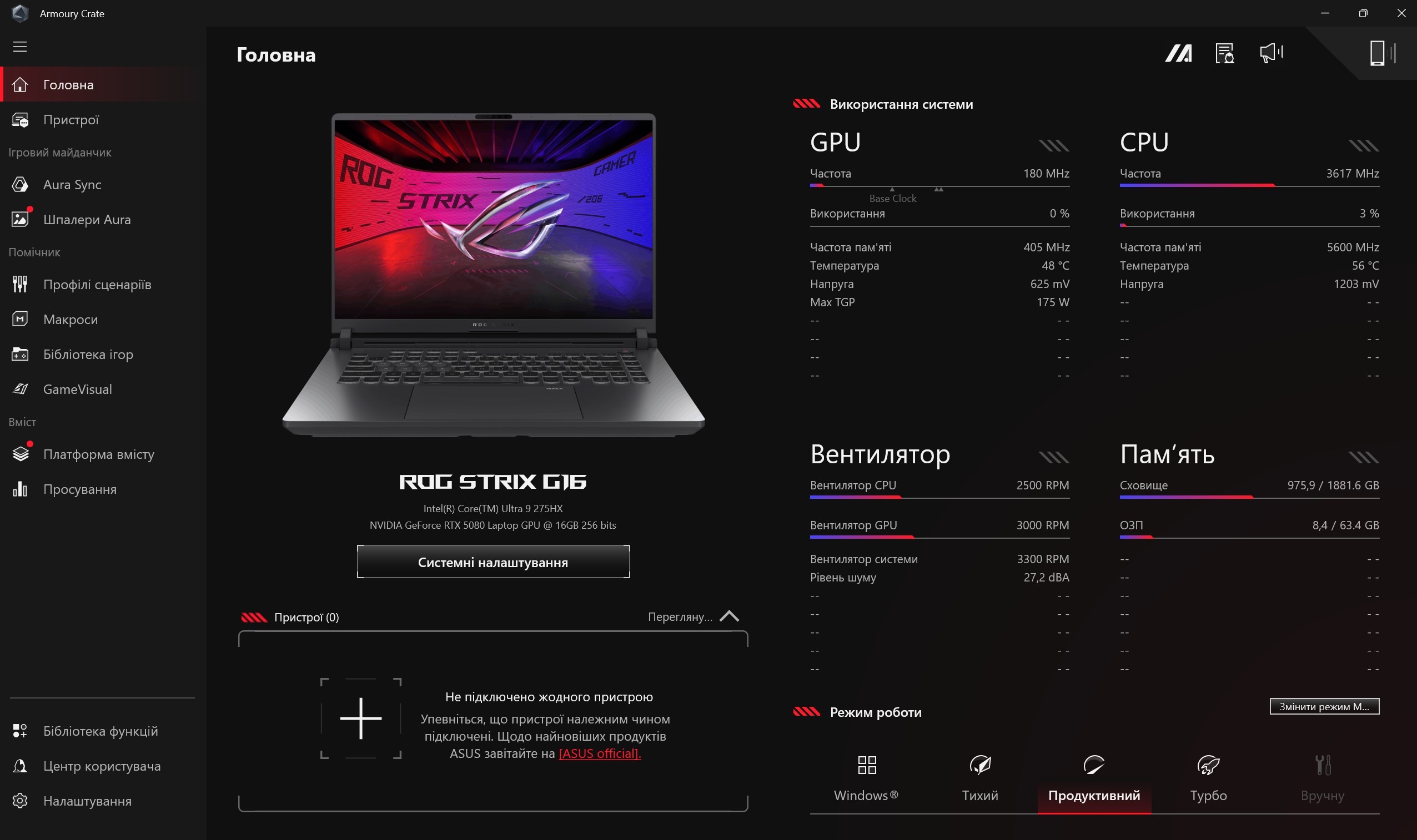Для налаштування ноутбука використовується давно знайомий застосунок ROG Armoury Crate. На головній сторінці відображається модель ноутбука, поточні показники системи та перемикач режимів роботи. Включно з ручним, який дозволить розігнати ASUS ROG Strix G16 (2025) на максимум і налаштувати роботу вентиляторів охолодження. У розділі "Пристрої" зібрана решта налаштувань у декількох вкладках. Перша відповідає за швидкі налаштування (вимкнення кнопки Win, Fn, тачпаду, розгін, енергозбереження матриці тощо). У другій вкладці можна налаштувати виділення пам'яті для інтегрованої графіки та очистити пам'ять від непотрібних процесів. Третя вкладка — режими продуктивності відеокарти (MUX Switch). Далі вкладка з налаштуванням дій на додатковий верхній ряд клавіш. Останні дві вкладки відповідають за підсвічування та моніторинг системи у реальному часі.