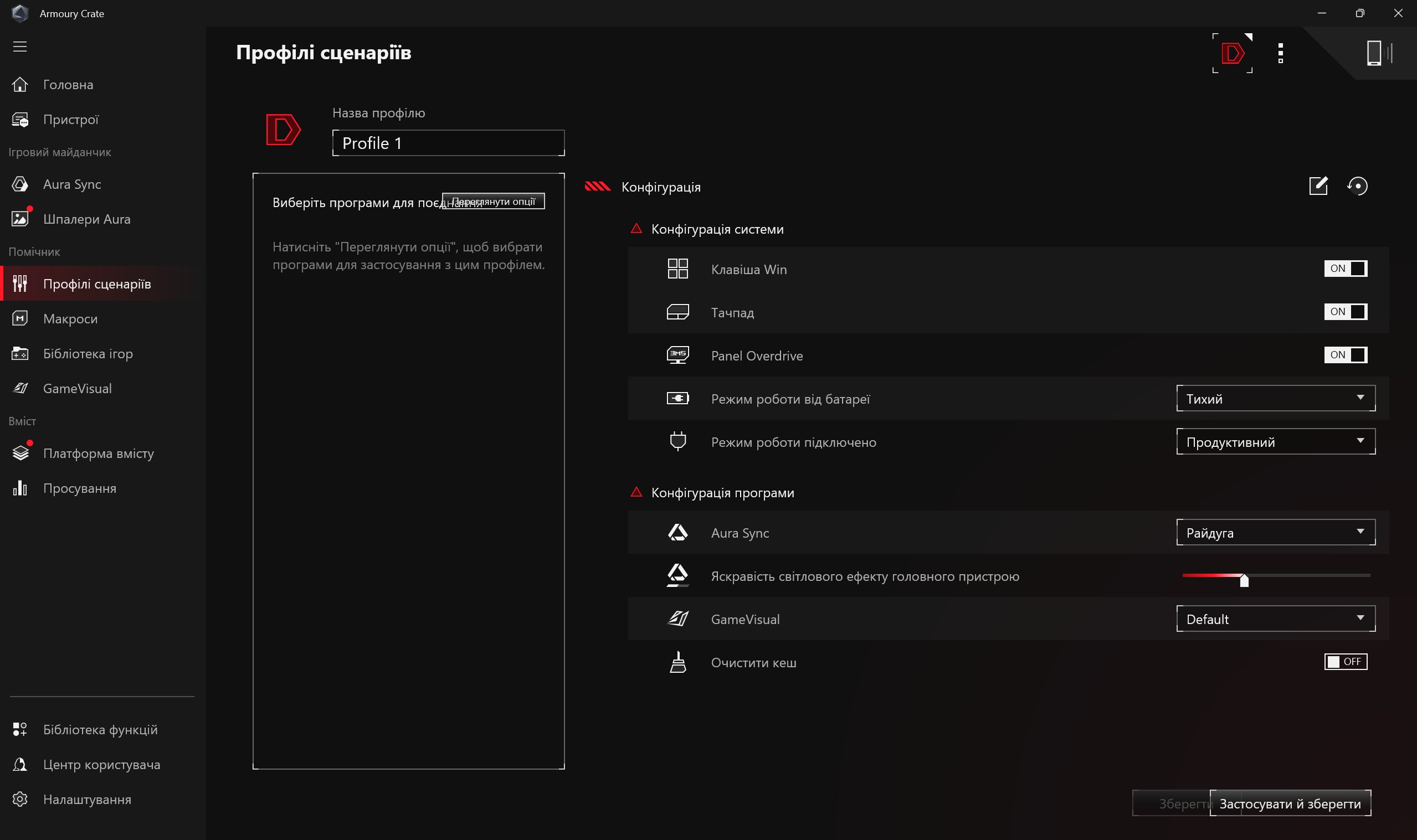 І окремо є традиційний застосунок MyASUS з базовим набором налаштувань та оновленням деяких елементів системи: