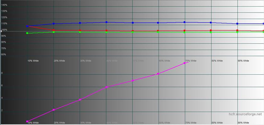Максимальна яскравість екрана у SDR-режимі становить 390.318 кд/м². Передача кольорів точна, перехил в бік холодних відтінків мінімальний. А колірне охоплення істотно ширше за sRGB:
