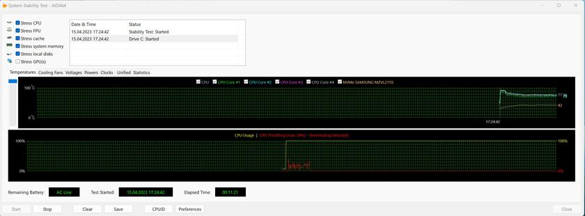Система охолодження включає в себе два низькопрофільні вентилятори. Зазвичай при невеликому навантаженні вони не вмикаються і ноутбук працює абсолютно тихо. Це стосується роботи з документами, браузером. При максимальних навантаженнях вентилятори чутно, але працюють вони тихо. Корпус майже не гріється. Але Throttling Test в AIDA64 показав, що першу хвилину-півтори максимального навантаження процесор гріється до приблизно 93° і є троттлінг. Після адаптації СО, температура знижується до 77° і тримається на такому рівні, ноутбук працює стабільно