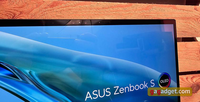 Екран займає 85% верхньої панелі, по бокам проміжки дійсно дуже тонкі. І рамку, і сам дисплей захищає Corning Gorilla Glass NBT. Тож на сонці буде відблискувати. Над екраном виявилось багато цікавого. Звісно ж веб-камера з індикатором та мікрофонами. А окрім цього — подвійна інфрачервона камера для ідентифікації власника, датчик освітлення для авторегулювання яскравості, а також датчик RGB для автоматичного регулювання колірної температури дисплея залежно від оточуючого освітлення. Веб-камера має роздільну здатність FullHD та має ряд функцій для покращення зображення ASUS AiSense: розмиття фону, корекція яскравості, корекція напрямку погляду, відстеження рухів, фільтри та технологія тривимірного усунення шумів ASUS 3D Noise Reduction (3DNR) у реальному часі.