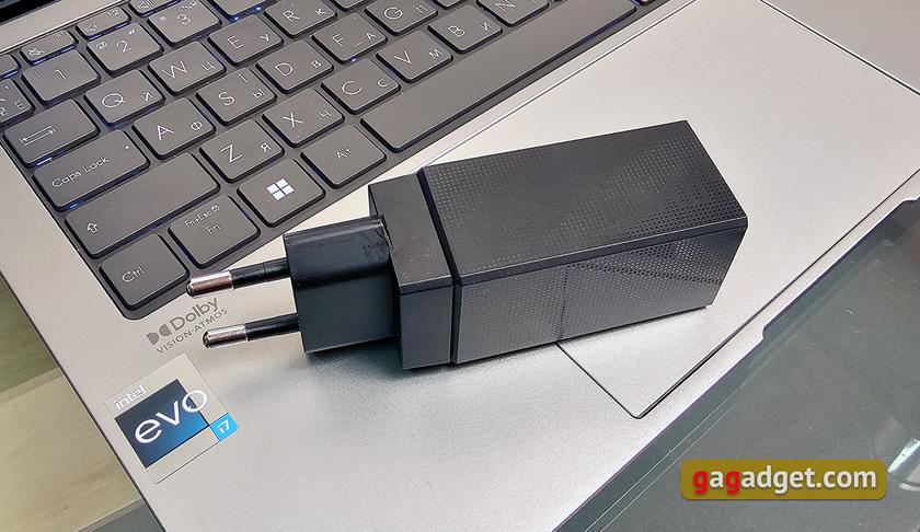 ASUS Zenbook S 13 OLED (UX5304V) приїхав у оновленому пакуванні. ASUS особливо акцентує увагу на екологічності цієї моделі. У пакуванні використовується лише папір виготовлений із деревини лісів, що керуються відповідно до принципів відповідального лісокористування, контрольованої деревини та перероблених матеріалів. Не використовується клей та пластик. В комплекті — сам ноутбук, блок живлення 65 Вт зі змінним кабелем, чохол та документація. Зазвичай блоки живлення мало чим цікаві. Але в цьому випадку є на що подивитись: він дуже компактний. Компактніший, ніж деякі сучасні блоки живлення для смартфонів.