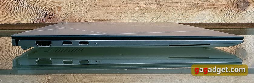 ASUS Zenbook S 13 OLED (UX5304V) дуже тонкий: всього 10.9 мм. Компанія стверджує, що це — найтонший 13-дюймовий ноутбук з OLED-дисплеєм. Роз'ємів не так багато, що цілком звично для настільки компактних моделей. Але для двох повнорозмірних портів місце все ж таки знайшлось. На лівій грані є два Thunderbolt 4 з підтримкою Power Delivery та DisplayPort, індикатор заряджання, повнорозмірний HDMI 2.1 (TMDS) та лівий динамік. Вони у цьому ноутбуці зроблені у вигляді прорізів на бокових гранях.