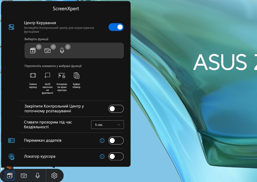 ScreenXpert з деякими корисними функціями, як швидке перемикання додатків, створення скріншотів, швидкі вимикачі мікрофона, камери тощо.