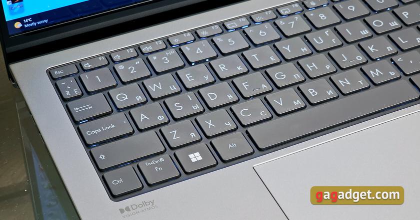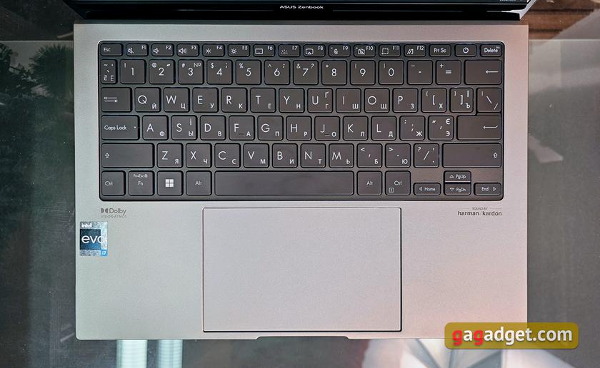 Клавіатурний блок разом з клавішами вирішили зробити темно-сірого кольору. Розкладка клавіш абсолютно стандартна для актуальних ASUS Zenbook та загалом типова для ультрапортативних моделей. Вона не має додаткового цифрового блока, верхній ряд функціональних кнопок та блок стрілок мають зменшені розміри. Верхній ряд закінчується клавішою Delete, а не кнопкою живлення. Home, End, PgUp та PgDn дублюються зі стрілками через Fn. Обидва Shift довгі, Enter та Backspace однорівневі. Сканер відбитків пальців відсутній, що цілком компенсується інфрачервоними камерами для ідентифікації власника.