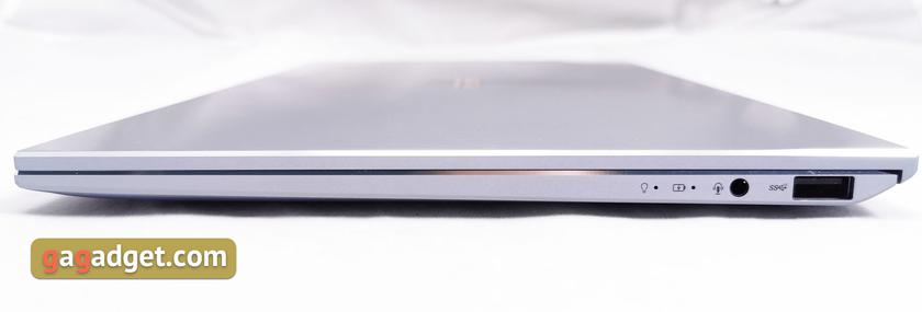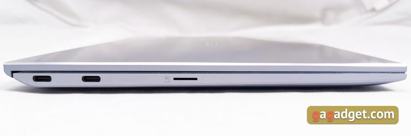 Компактність не найкращим чином позначилася на кількості роз'ємів ноутбука. Зліва розміщені два порти USB 3.1 Gen 2 Type-C з підтримкою швидкої зарядки і підключення зовнішнього монітора. Але Thunderbolt не завезли, на жаль. На цьому ж торці - кардрідер для MicroSD. Фотографи не особливо оцінять, але для власників усіляких екшн-камер - саме те:
