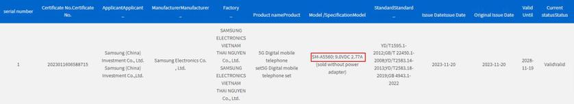 У документах, Galaxy A55 5G проходить з номером моделі SM-A5560. Смартфон поставлятиметься з підтримкою швидкої зарядки на 25 Вт. До речі, точно таку ж зарядку має актуальний смартфон Galaxy A54 5G.