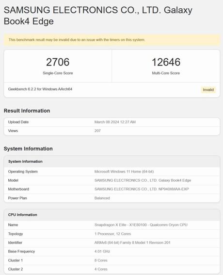 Galaxy Book4 Edge використовує Snapdragon X Elite XE8100100 з 12 ядрами, а "базова частота" становить 4.01 ГГц. Бенчмарк показує, що основні оцінки становлять: одноядерний - 2,706 і багатоядерний - 12,646. Ці оцінки говорять про те, наскільки добре чип виконує завдання, використовуючи тільки одне ядро ЦП або кілька ядер одночасно.