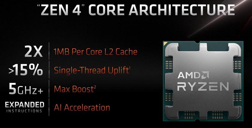 За аналогією з попередниками, Ryzen 7000 побудовані з декількох чиплетів. Один або два CCD з максимум восьми процесорних ядер архітектури Zen 4, яка в середньому на 13% швидша за Zen 3 при рівній частоті. Але ж і частота підросла, як при одноядерному, так і багатоядерному навантаженні — авторозгін вище 5 ГГц. Що стало можливим завдяки переходу на енергоефективний техпроцес TSMC 5 нм. Зрозуміло, нікуди не поділася підтримка розпаралелювання на два віртуальних обчислювальних потоки SMT.
