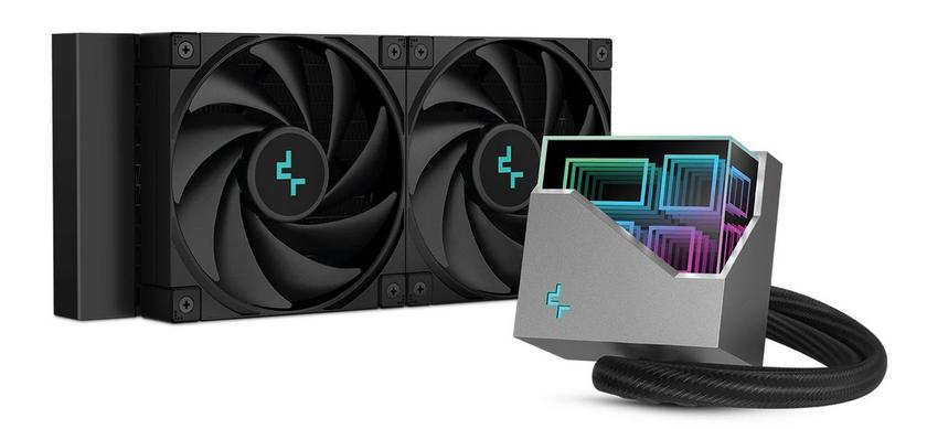 Базується на новітній помпі Asetek 4-покоління з трифазним електромотором і швидкістю прокачування холодоагенту 3100 об/хв. Має цілісну мідну підошву з великою кількістю мікроканалів усередині для прискорення розсіювання тепла від процесора. Пара комплектних вентиляторів представлена флагманськими DeepCool FK120 з гідродинамічним підшипником. Сильно загнуті вниз лопаті створюють підвищений тиск, щоб наскрізь продувати радіатор. А кришка помпи декорована синхронізованим ARGB підсвічуванням зі стильним 3D-ефектом.