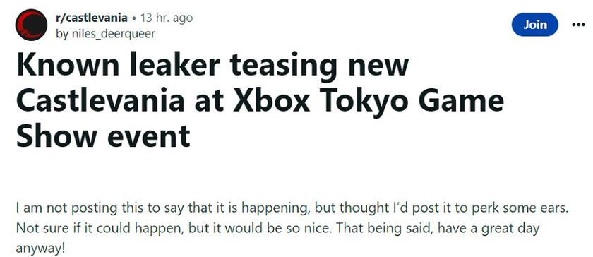 Інсайдер натякнув, що найближчим часом відбудеться якийсь цікавий і несподіваний анонс, пов'язаний із франшизою Castlevania. Можливо, це станеться на Tokyo Game Show 2023