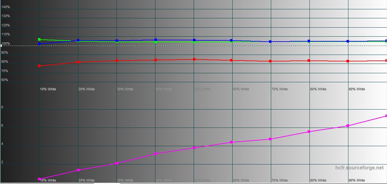 Екран дійсно справляє чудове враження: максимальні кути огляду, великий запас яскравості та надзвичайно насичена картинка, що нагадує OLED екрани. Апаратні вимірювання проводились у режимі DCI-P3. Максимальна яскравість склала 654.845 кд/м2. Покриття колірного простору значно ширше за sRGB, а показники колірної температури та складових RGB близькі до еталонних значень. Є зовсім невеликий перехил до холодних відтінків.