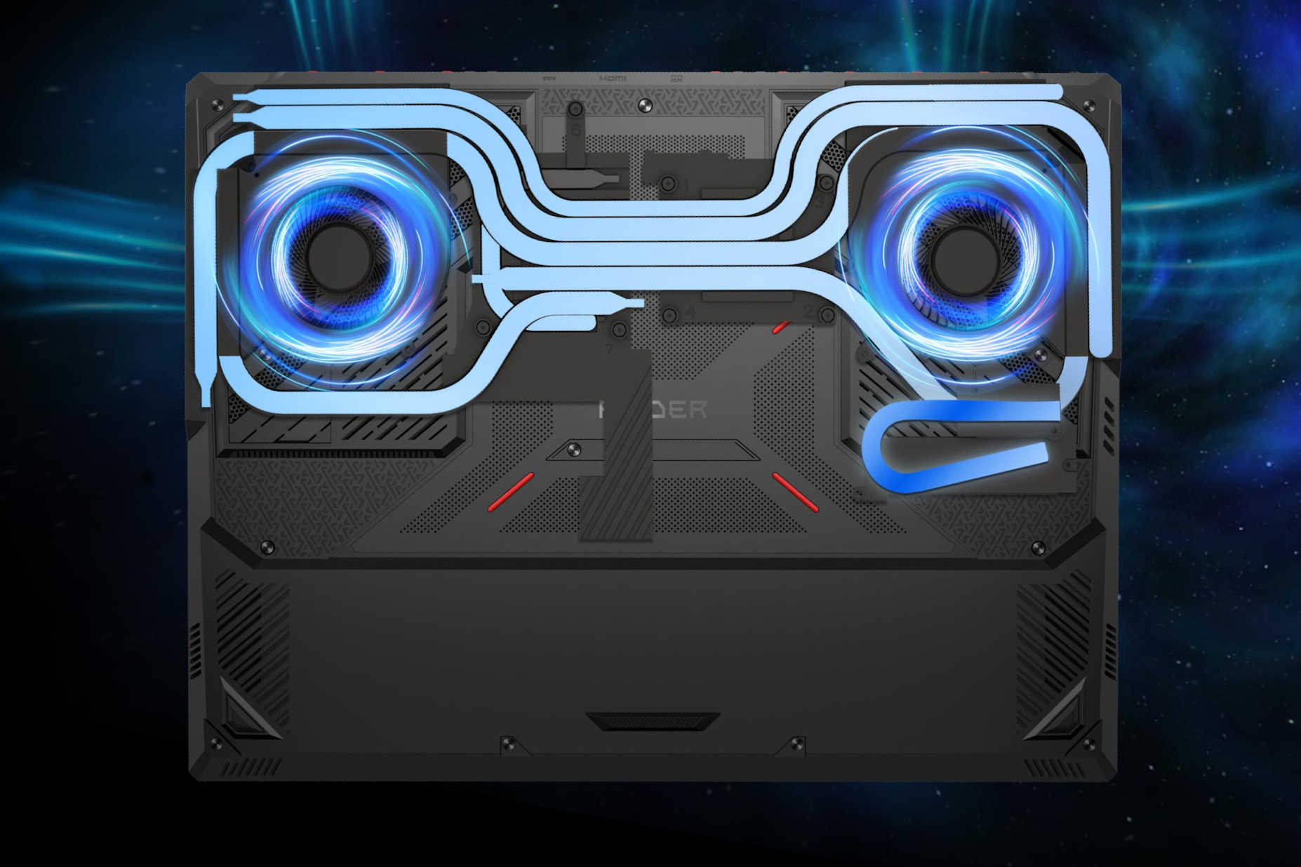 Система охолодження MSI Raider 18 HX AI A2XW включає два великих вентилятори та сім теплових трубок. Включно з окремою для накопичувача SSD NVMe PCIe Gen5.