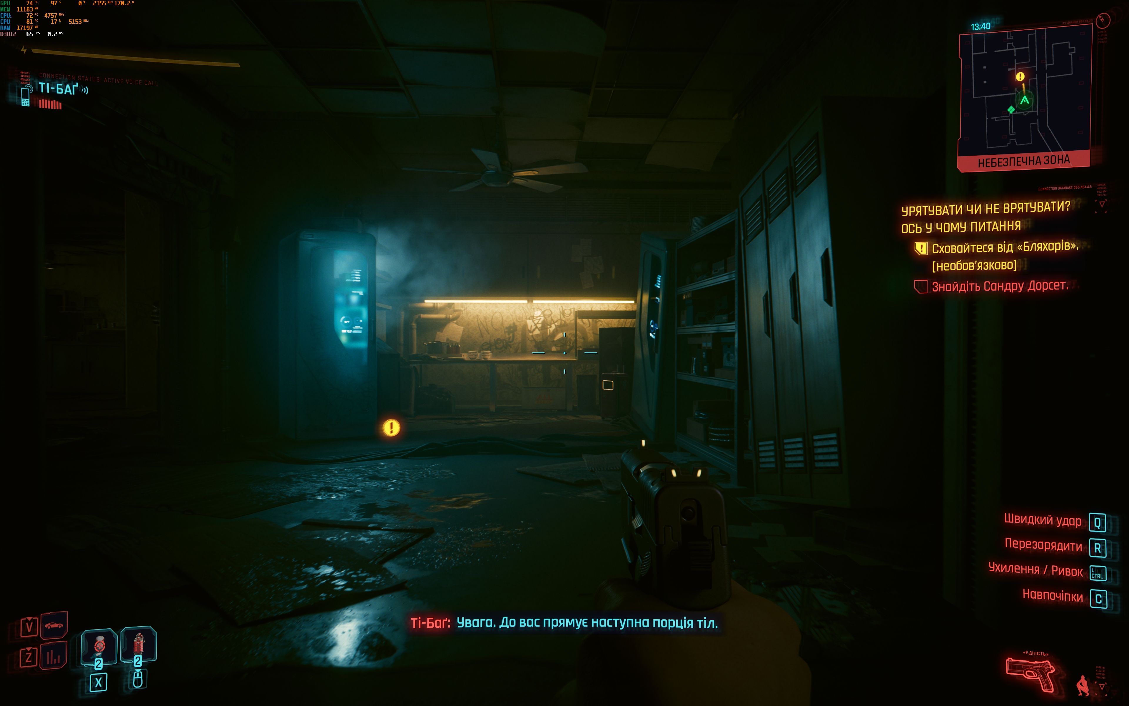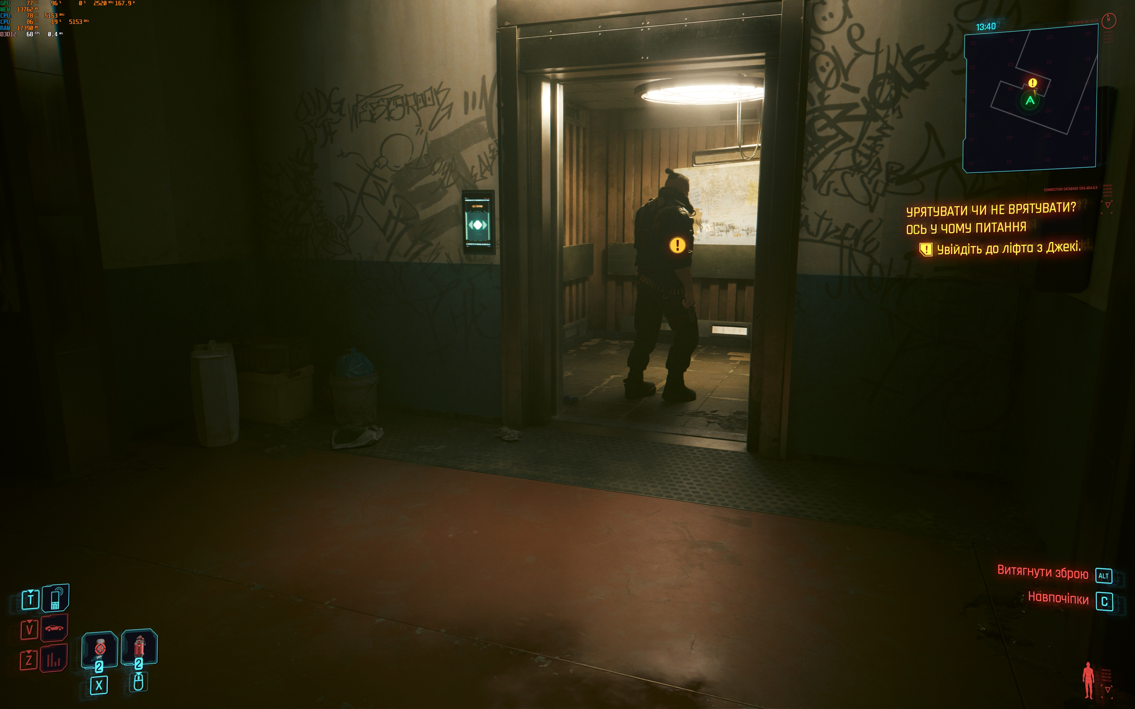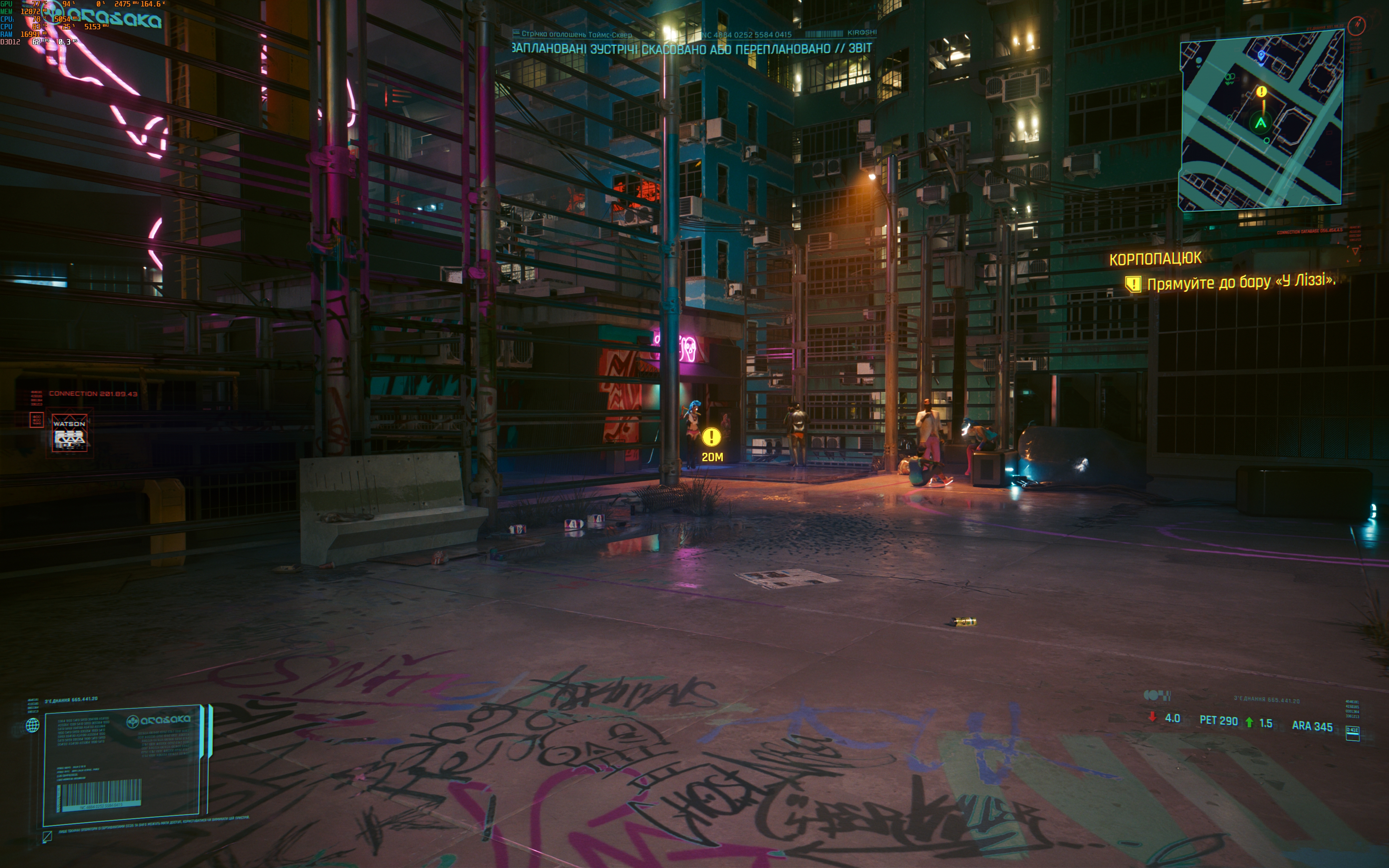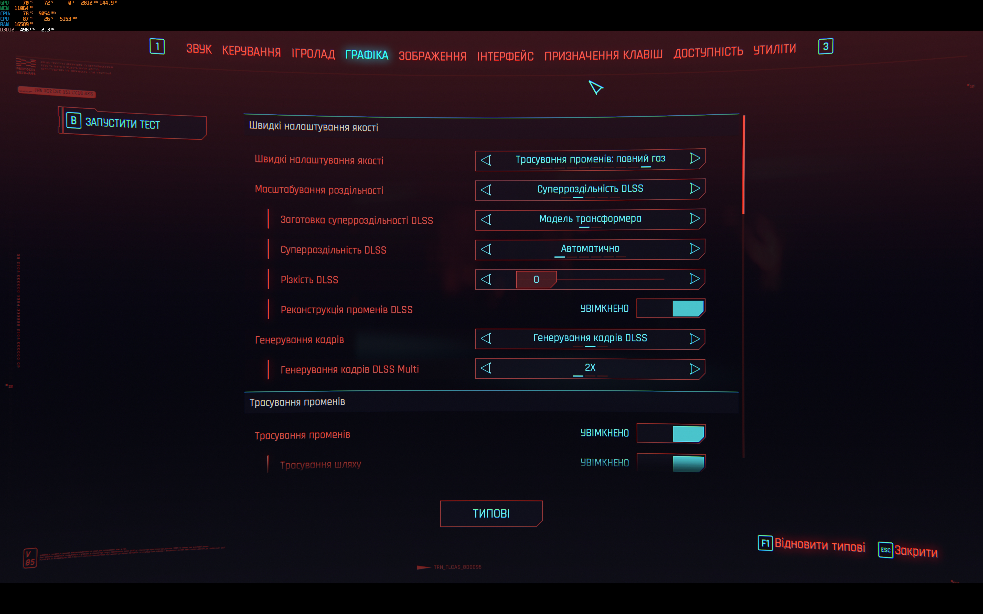 - Cyberpunk 2077. Максимальні налаштування, включно з трасуванням шляху. DLSS в автоматичному режимі з генеруванням кадрів. 60-80 FPS
