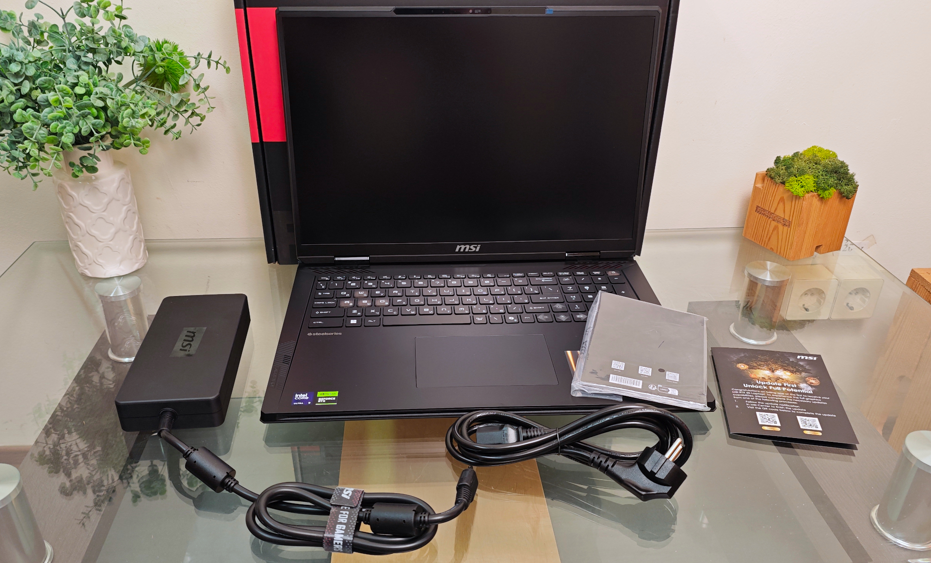MSI Raider 18 HX AI A2XW постачається у відносно невеликій (зважаючи на розміри самого ноутбука) коробці чорно-червоного кольору. Попри високу ціну, ніяких бонусів у комплекті чекати не варто. Набір стандартний: сам ноутбук, масивний блок живлення потужністю 400 Вт, силовий кабель та уся необхідна документація.