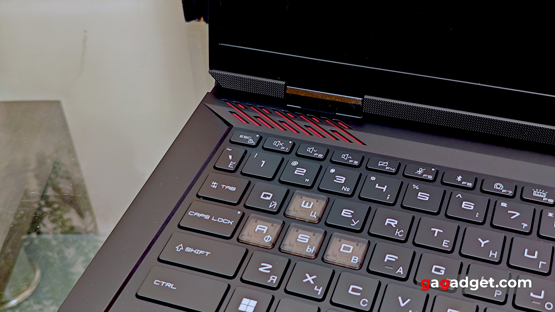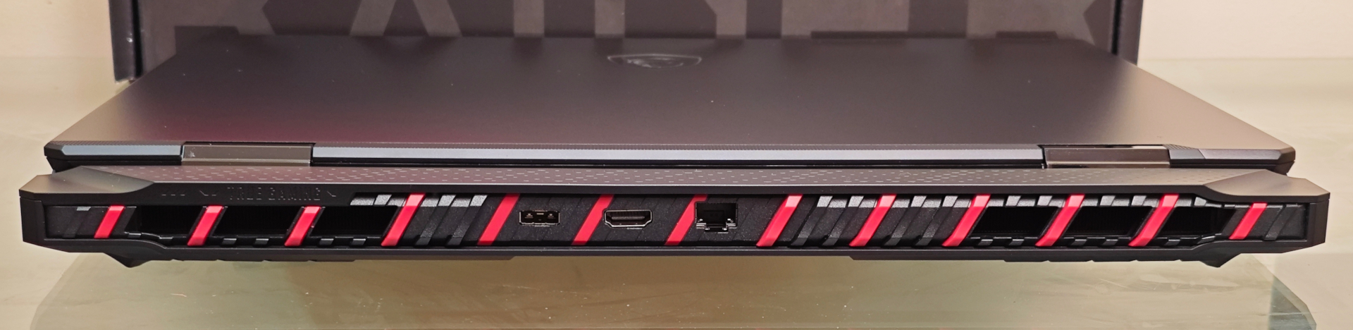 На передній грані ноутбука розташувалась тонка смужка з RGB-підсвічуванням, яке можна налаштувати за допомогою фірмового програмного забезпечення. Це виключно декоративний елемент, хоча теоретично його можна було б використати для індикації. Наприклад, рівня гучності чи заряду акумулятора.