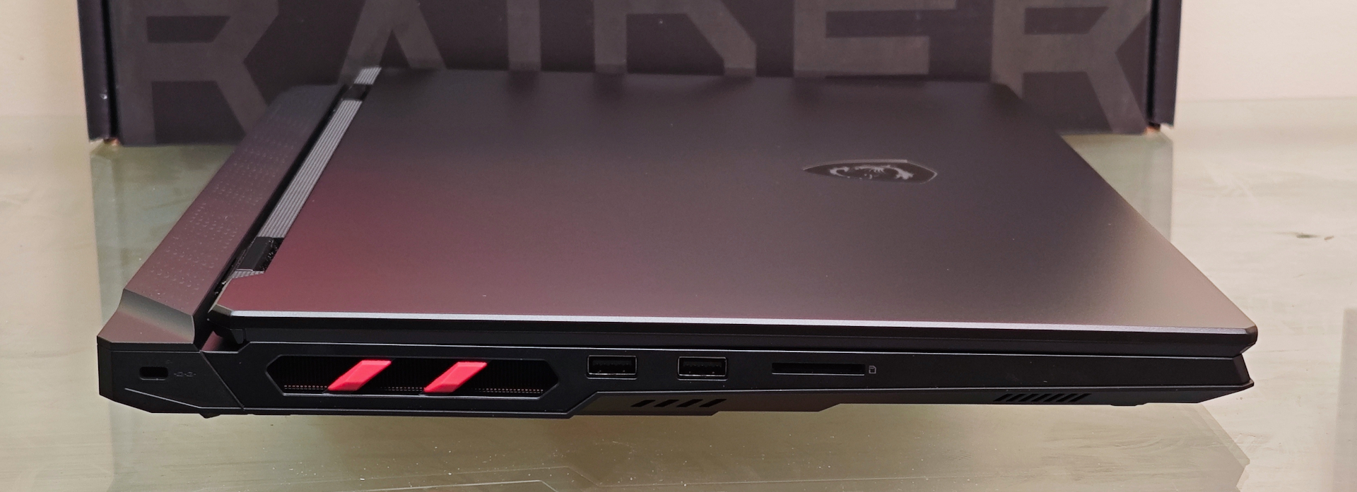 Роз'єми розташовано і на бічних гранях, і позаду. Як і велика кількість вентиляційних отворів. На лівій грані, окрім вентиляційної зони з червоними декоративними елементами, розташовані два USB Type-A 3.2 Gen 2, а також кардрідер для карт формату SD.