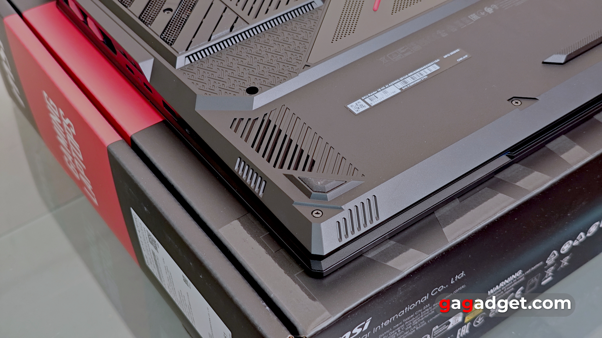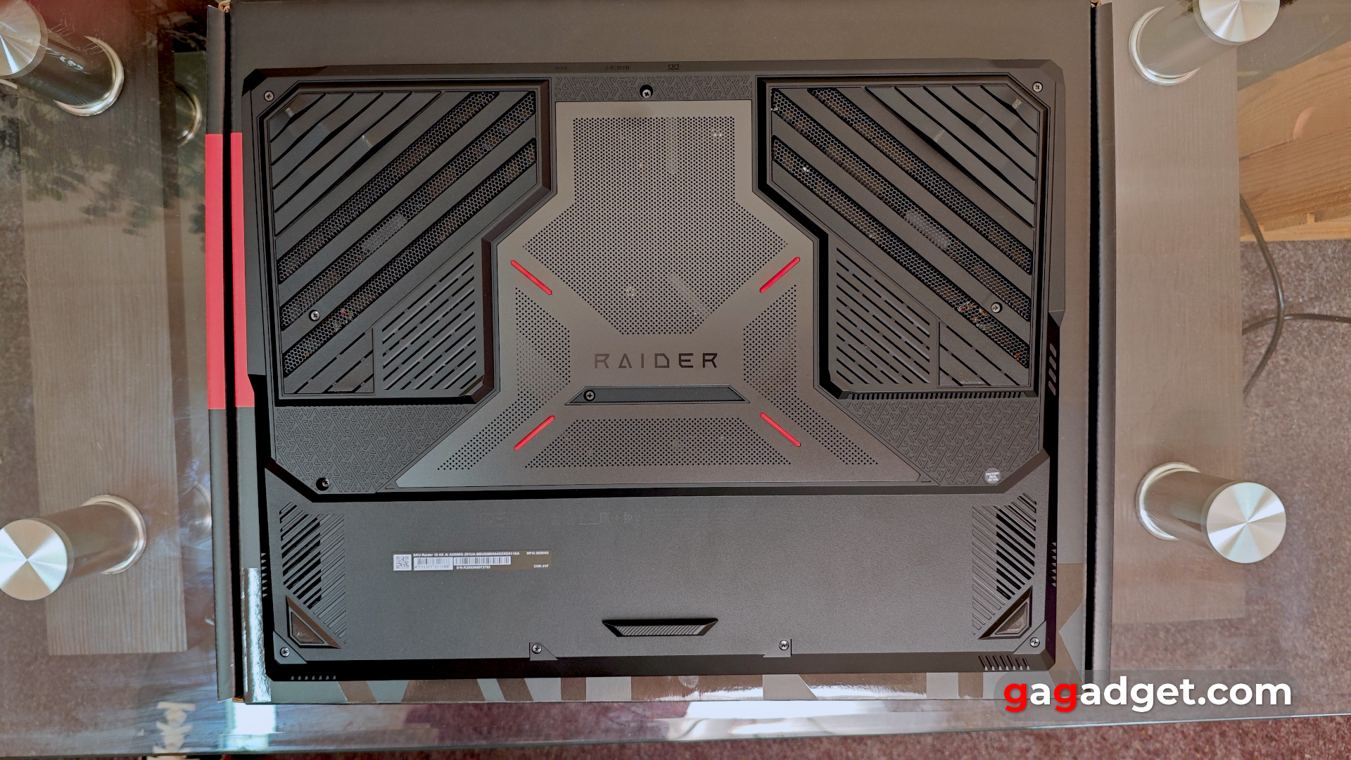 На нижній кришці MSI Raider 18 HX AI A2XW багато отворів для охолодження, гумових ніжок та гвинтів для кріплення кришки. Посередині — назва лінійки Raider та чотири декоративні червоні вставки. Єдиний не дуже приємний момент — один з гвинтів закритий заводською пломбою. Тож схоже, що користувач втратить гарантію при самостійному апгрейді. А він передбачений: окрім двох слотів для оперативної пам'яті, ноутбук має два роз'єми для SSD-накопичувачів формату M.2. Один NVMe PCIe Gen4 та один нового стандарту NVMe PCIe Gen5. І у нашій конфігурації останній залишили вільним.