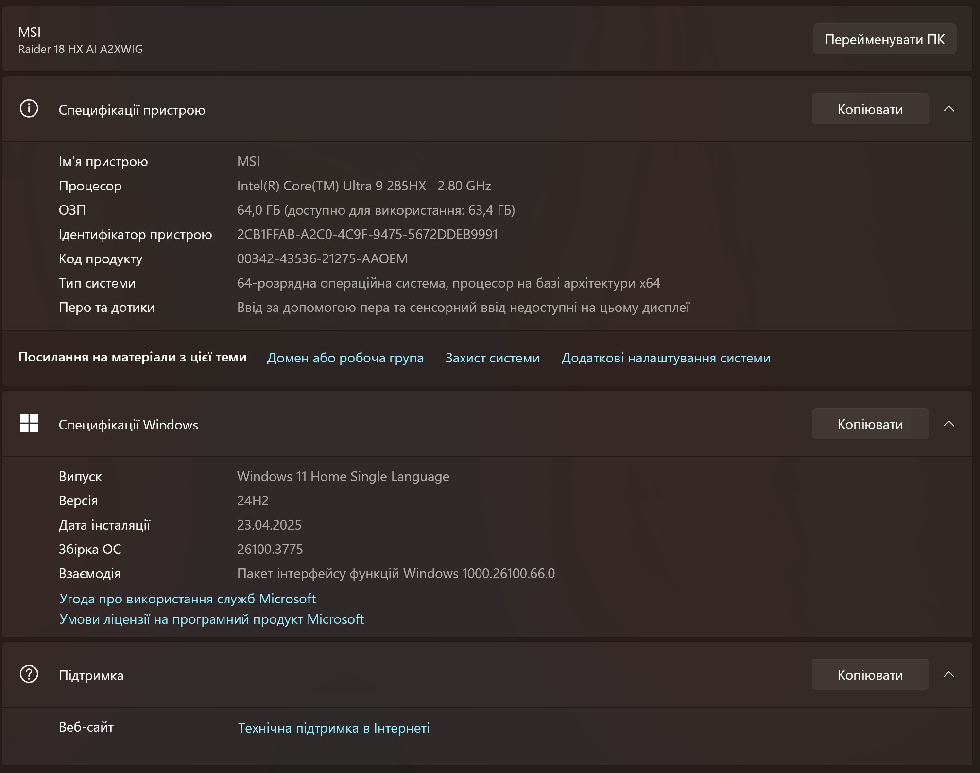 Програмне забезпечення MSI Raider 18 HX AI A2XW