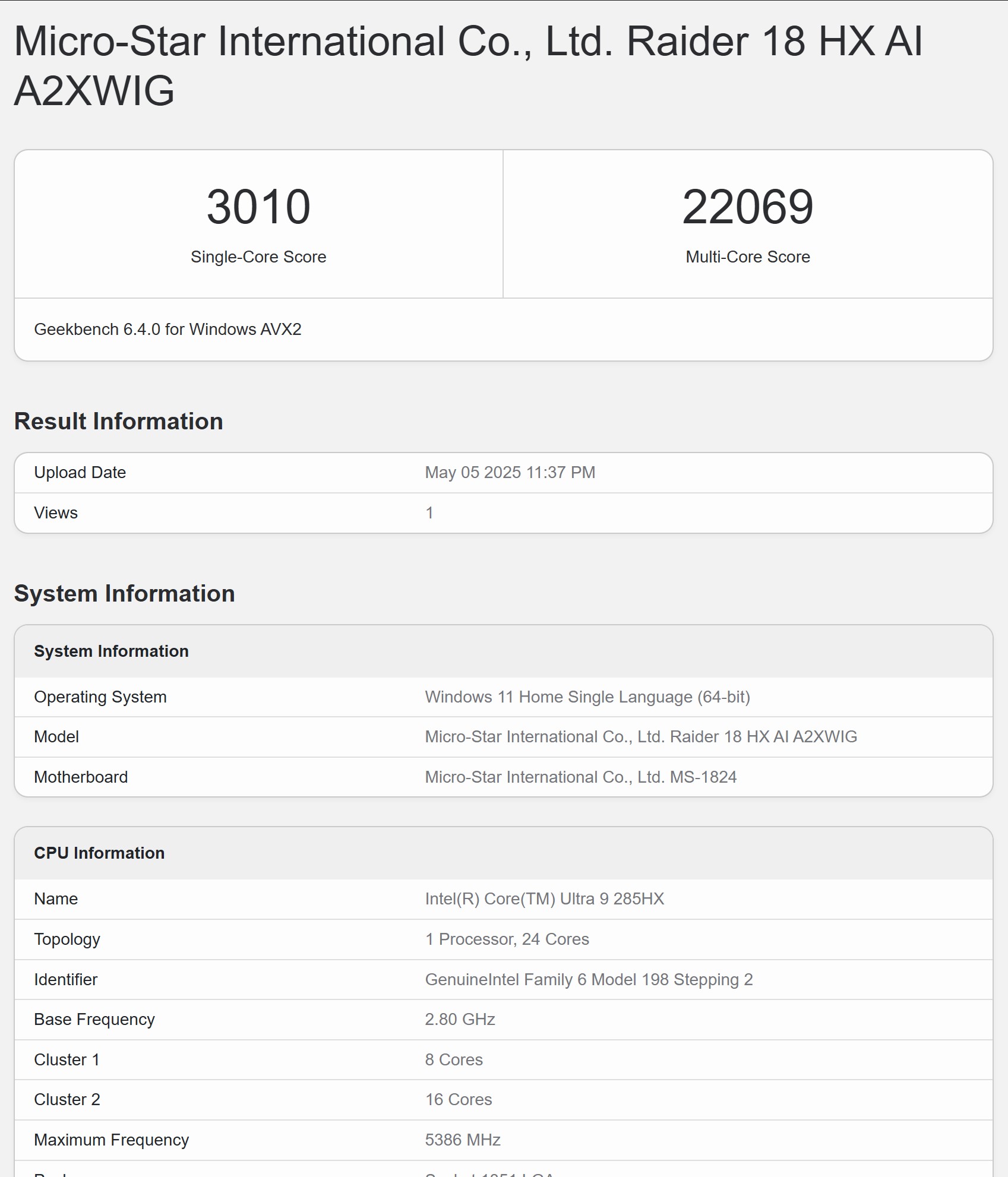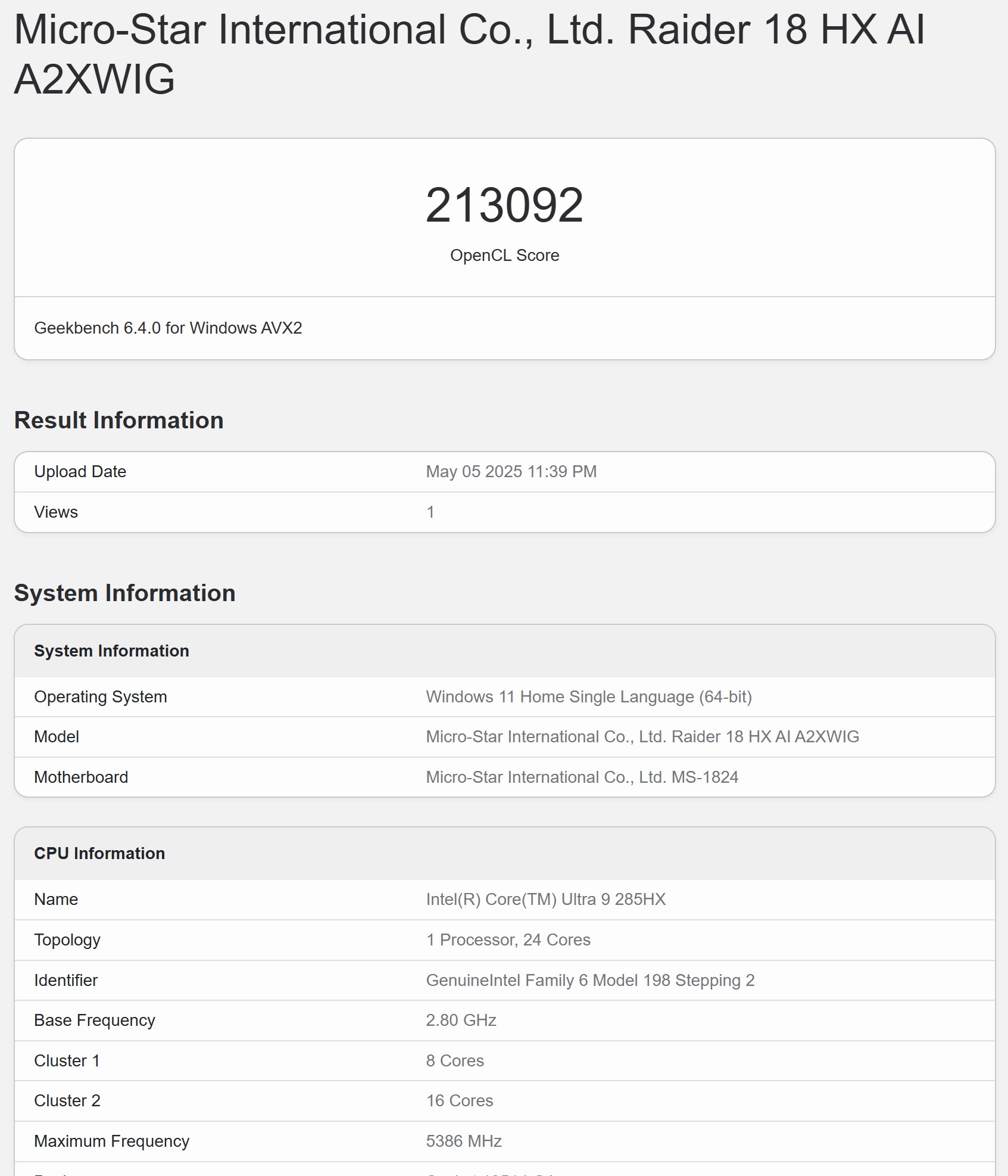 В MSI Raider 18 HX AI A2XW встановлено актуальні дуже потужні компоненти. У якості процесора встановлено флагманський 24-ядерний Intel Core Ultra 9 275HX сімейства Arrow Lake, що виробляється за TSMC N3B техпроцесом. Він містить 8 продуктивних ядер з частотою до 5,4 ГГц, 16 енергоефективних ядер до 4,6 ГГц та блок Intel AI Boost NPU продуктивністю 13 TOPS. 36 МБ кеш. Базовий рівень TDP — 55 Вт, Boost — у даному випадку до 85 Вт. Вбудований графічний прискорювач Intel Graphics має 8 ядер, частота до 2.0 ГГц. Оперативна пам'ять — 64 ГБ DDR5-6400 (2х32 ГБ), працює у двоканальному режимі, максимальний об'єм — 96 ГБ. Бездротові інтерфейси: Bluetooth 5.4 та швидкий Wi-Fi 7(802.11be) (потрійний діапазон) 2х2, також є дротовий Ethernet 2.5 Gbps, що дуже доречно у випадку ноутбука, який стоятиме переважно на одному місці. Як дискретний відеоприскорювач використовується топова NVIDIA GeForce RTX 5080 Laptop. TGP: до 175 Вт. Частота — до 2287 МГц з Dynamic Boost. Обсяг відеопам'яті 16 ГБ GDDR7. Ноутбук оснащений мультиплексором MUX Switch для прямого підключення відеокарти до дисплея для зменшення затримки та збільшення продуктивності. Максимальна загальна потужність на процесор та відерокарту може сягати 260 Вт.