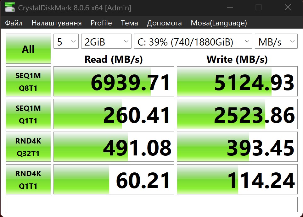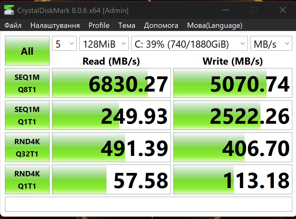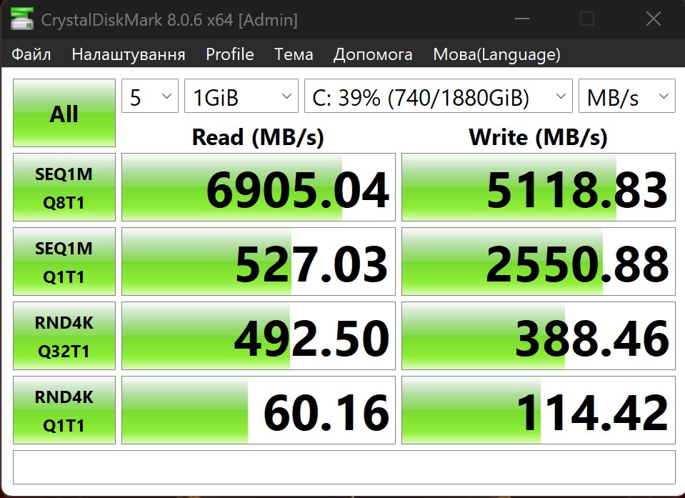 Хоча встановлений накопичувач і демонструє хорошу швидкість роботи. До 6900 МБ/с під час зчитування даних, та близько 5100 МБ/с при записі.