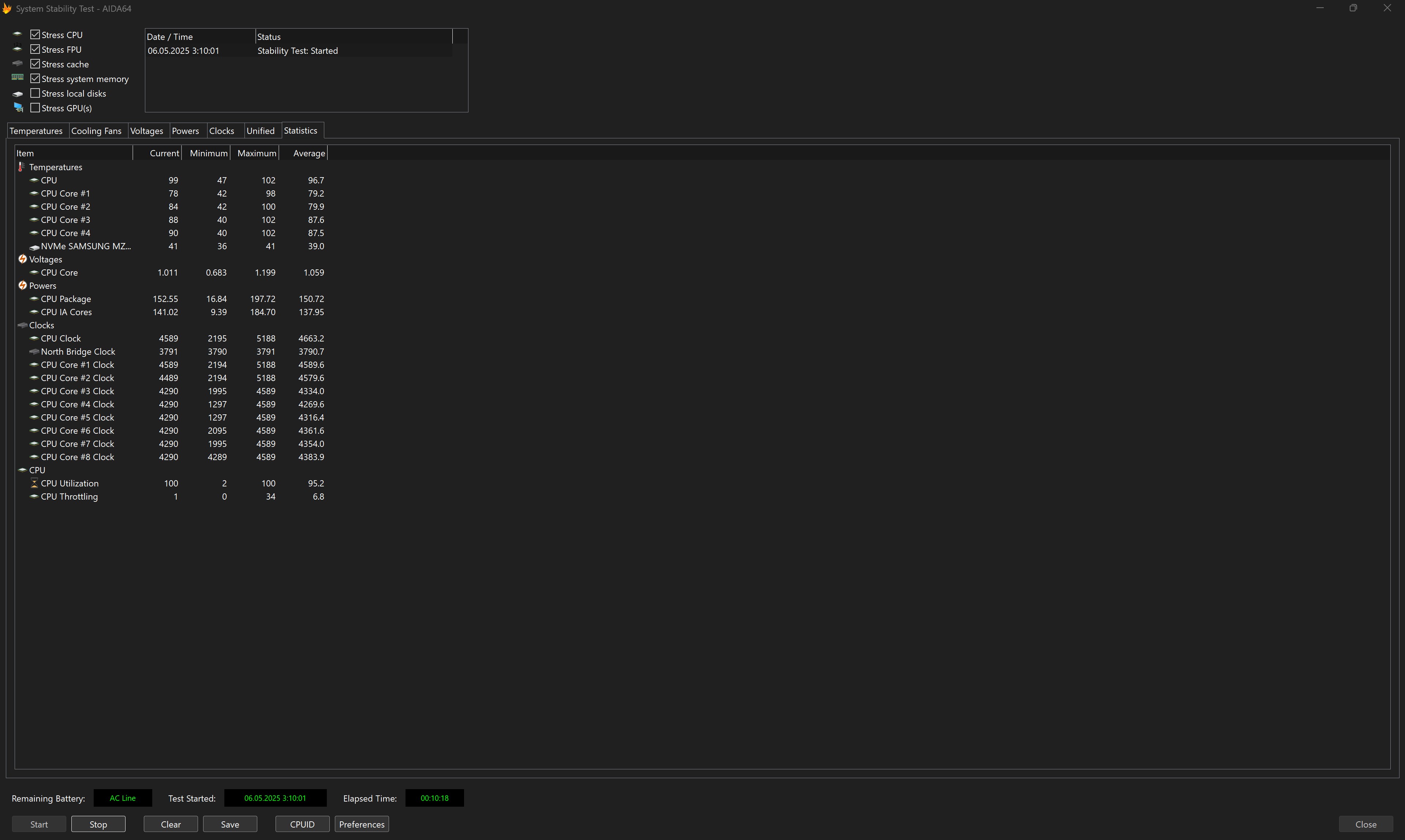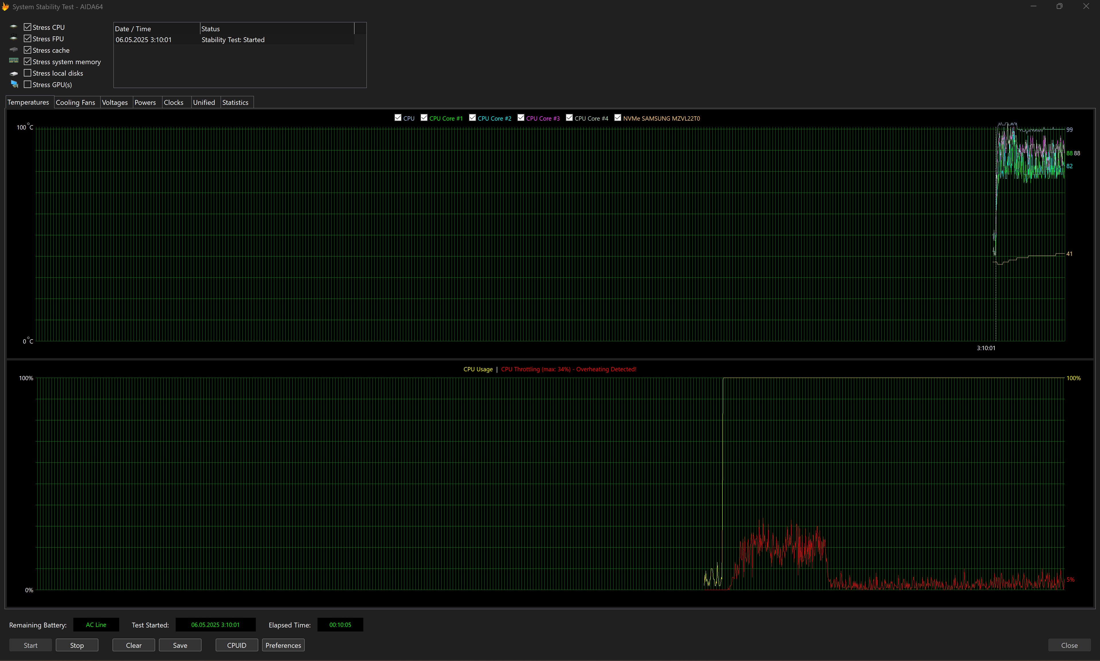 Стрес-тест AIDA64 показав, що за максимального навантаження процесор спочатку гріється навіть трохи більше, ніж 100° і спостерігається тротлінг до 34%. Далі система стабілізується, температура процесора тримається трохи нижче 100°, тротлінг вже у межах 5%. При цьому середня частота процесора становить 4.66 ГГц, що дуже непогано. Потенційним власникам ноутбука варто мати гарнітуру, адже при високому навантаженні система охолодження працює дуже гучно.