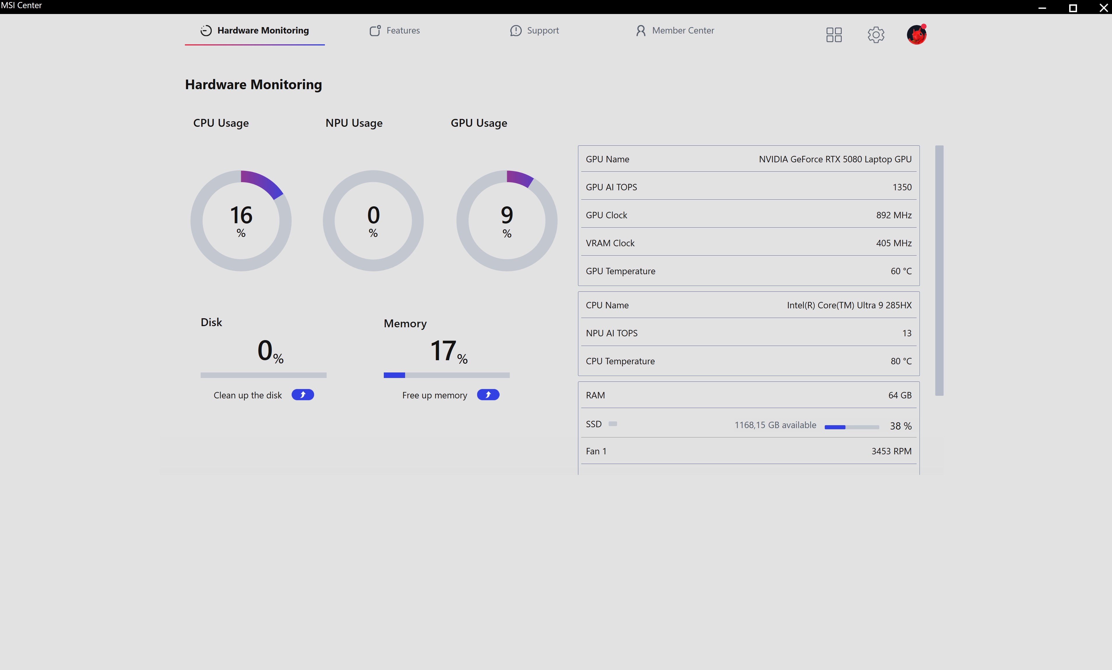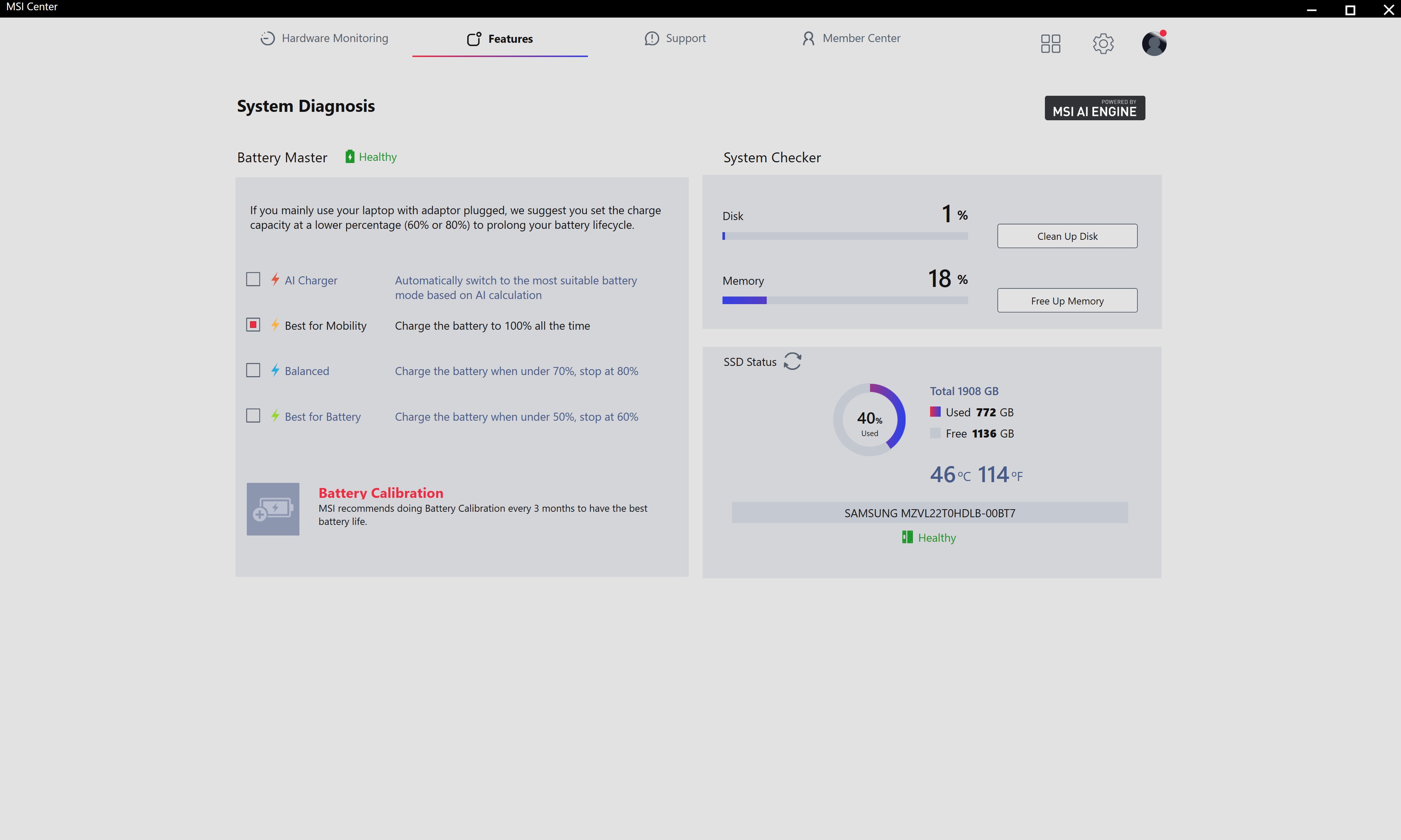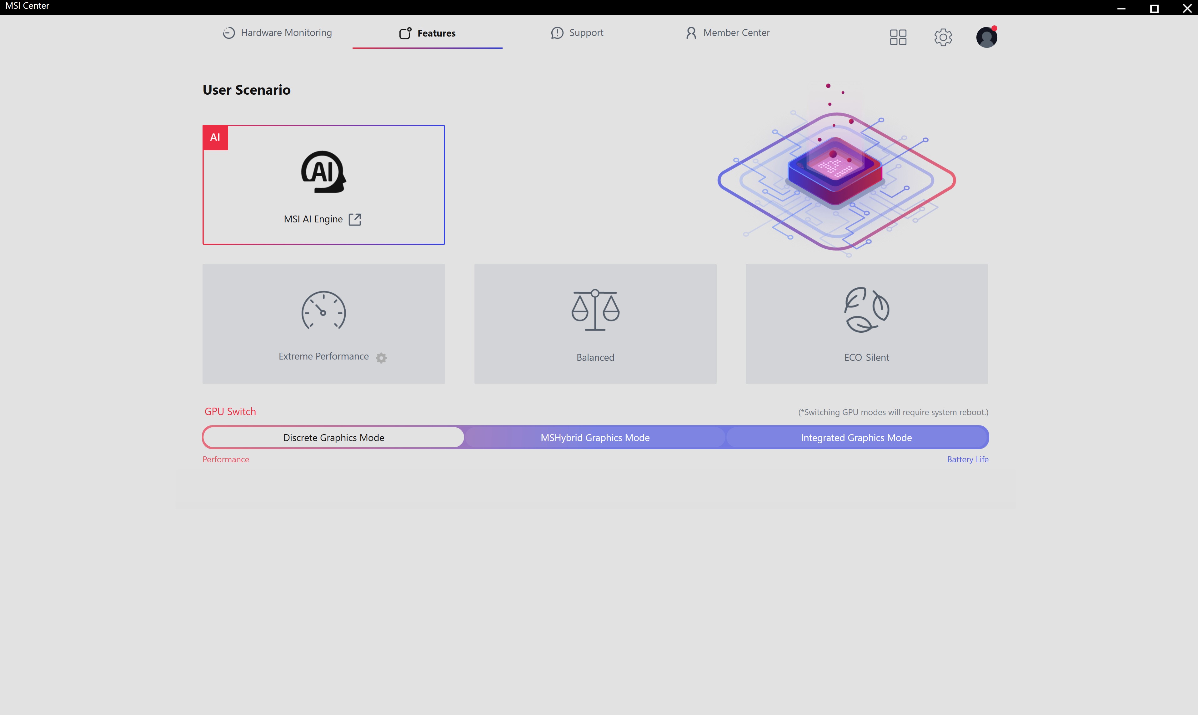 Для налаштування MSI Raider 18 HX AI A2XW використовується три основних застосунки. MSI Center відповідає за усі основні налаштування системи, включно з режимами роботи, відеоприскорювача (MUX Switch), AI Engine (автоматичне підлаштування роботи системи під поточні завдання), моніторинг та діагностика системи тощо.