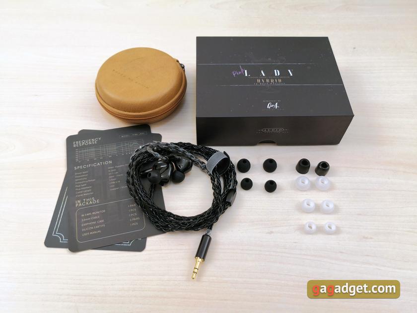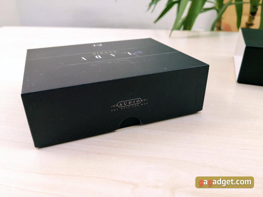 Поставляються навушники у невеликій чорній коробці цілком стандартного вигляду із зовнішньою "обкладинкою" з м'якого картону та жорсткою внутрішньою коробкою. Зовні не так багато всього: назва моделі, логотип бренду та короткі специфікації на зворотному боці. З дивного - напис на боковині, в якому йдеться "Not only for men". Усередині коробки - пара карток з детальнішою інформацією, включаючи посилання з QR-кодами та графік АЧХ. Весь комплект поставки вмістився у невеликий круглий кейс для перенесення зі світло-коричневого шкірозамінника. Всередині - навушники з кабелем, 6 пар силіконових насадок з широким і вузьким отвором (по три штуки різного розміру) та пара пінних.