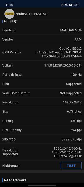 В realme 11 Pro+ встановлено 6.7-дюймовий AMOLED-дисплей з вигинами по бокам. Роздільна здатність 2412x1080 (співвідношення сторін 20:9), піксельна щільність — близько 394 ppi. Використовується 10-бітна матриця, що здатна відображати понад мільярд відтінків кольорів, стверджується, що колірне охоплення становить 100% простору DCI-P3. Обіцяють пікову яскравість у автоматичному режимі 950 кд/м². Є підтримка HDR10+. Максимальна частота оновлення становить 120 Гц, а зчитування сенсора — 1260 Гц. Частота роботи ШІМ — 2160 Гц, тож екран не має напружувати власників чутливих до цього очей. В налаштуваннях — типовий сучасний набір. Яскравість, темна та світла теми, масштаб інтерфейсу та тексту, частота оновлення (адаптивний, 60 та 120 Гц), режим комфорту для очей (більш теплі відтінки з можливістю роботи за розкладом) та режими відображення кольорів (яскравий, природний, додаткові "професійні") з налаштуванням колірної температури.