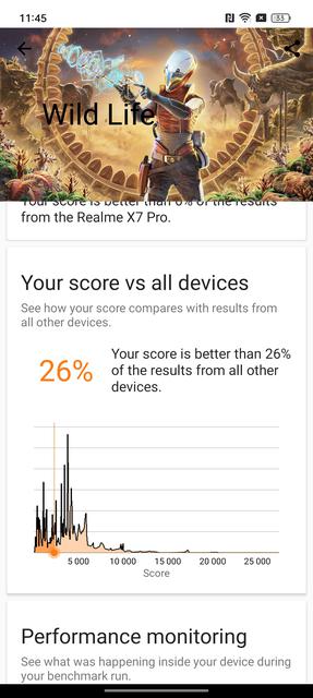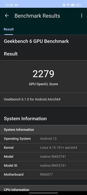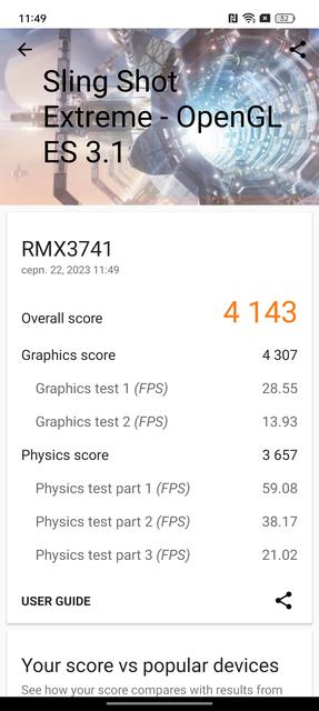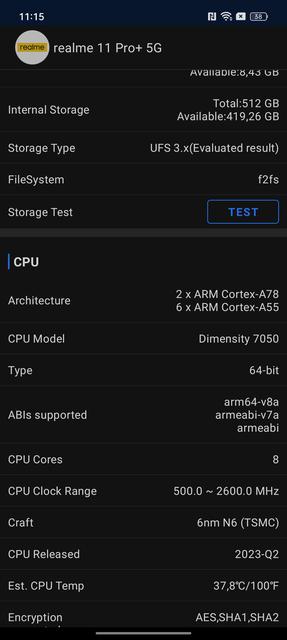 За продуктивність realme 11 Pro+ відповідає 6-нанметровий восьмиядерний процесор Mediatek Dimensity 7050. Фактично, це Dimensity 1080, що отримав ребрендинг. Він включає в себе два ядра ARM Cortex-A78 по 2.6 ГГц, шість енергоефективних ядер Cortex-A55 по 2.0 ГГц та графічний прискорювач GPU Mali-G68 MC4. Це процесор середнього сегменту з цілком відповідною продуктивністю. Оперативної пам'яті 12 ГБ з можливістю розширення за рахунок вбудованого накопичувача на 4/8/12 ГБ. Внутрішній накопичувач має об'єм 512 ГБ. Продуктивності смартфона достатньо для плавної і стабільної роботи інтерфейса та будь-яких важких застосунків. Нові ігри також працюють, але не варто чекати максимальних налаштувань графіки та високих показників FPS.