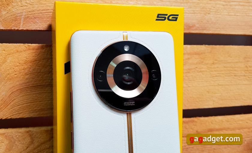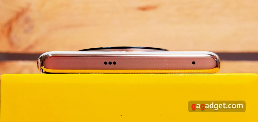 Модуль тильної камери також незвичний. Він зроблений у вигляді великої круглої шайби чорного кольору з золотистим колом всередині. Горизонтально розміщені три камери, а зверху — світлодіодний спалах. Камера досить сильно виступає над корпусом, але це зовсім не дратує завдяки симетричності. І на лежачи поверхні realme 11 Pro+ не хитається.