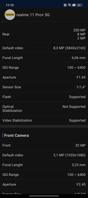 Ззаду у realme 11 Pro+ конфігурація з трьох камер. Безперечно, найцікавіша основна. Це — 200-мегапіксельна камера Samsung ISOCELL HP3. Фізичний розмір 1/1.4", пікселі 0.56µm. Оптика з діафрагмою f/1.69, 23 мм ЕФВ. Є оптична стабілізація та фазовий автофокус. Обіцяють 2х та 4х зум без зниження якості. Також є технологія автоматичного масштабування, що розпізнає об'єкт зйомки, автоматично збільшує масштаб і намагається утримати його в центрі кадру, тому вам не потрібно переміщати камеру. У стандартному режимі камера робить знімки 12 МП, хоча є режими 50 та 200 МП. Ультраширококутна камера — 8 МПSony IMX355, 16 мм f/2.2 без автофокуса. І третя — малоефективна макрокамера з роздільною здатністю 2 МП та фіксованим фокусом. Відео смартфон вміє писати в 4K@30fps, FullHD@30/60fps. Фронтальна камера — 32 МП, f/2.5, 22 мм.