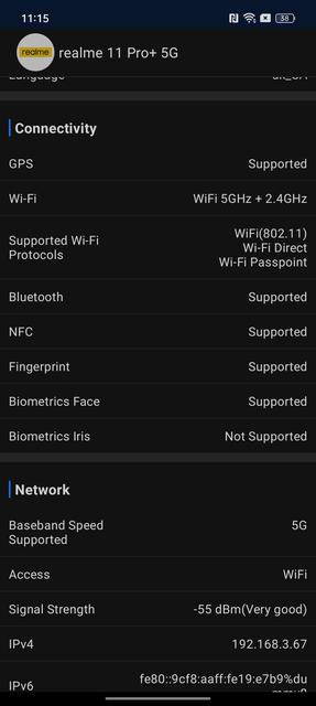 realme 11 Pro+ має увесь комплект сучасних бездротових комунікаційних можливостей. Дводіапазонний Wi-Fi 802.11 a/b/g/n/ac/6, Bluetooth 5.2 LE (SBC, AAC, aptX, aptX HD, LDAC), а також NFC для безконтактної оплати. Смартфон вміє працювати із глобальними системами позиціонування GPS, GLONASS, GALILEO, BDS, QZSS, NavIC. З точки зору відтворення музики у навушниках у смартфона все цілком стандартно. Звичний плеєр зі стандартним набором функцій і еквалайзером. Зі звуком через вбудовані стереодинаміки — цікавіше. Вони звучать голосно і доволі якісно. Навіть є натяки на низькі частоти. Також варто окремо згадати про дуже приємний і вібровідгук O-Haptics, що дійсно істотно відрізняється від більшості конкурентів.