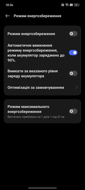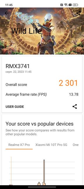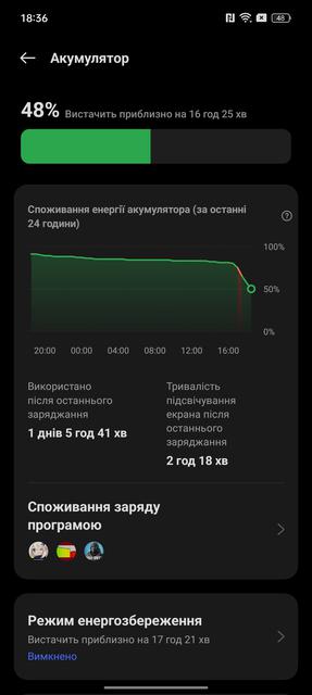 Ще одною перевагою realme 11 Pro+ виявилась автономність. В смартфоні використовується акумулятор типової для сучасних моделей ємності 5000 мАг. Але смартфон виявився доволі витривалим. При активному використанні (бенчмарки, ігри та активне використання камери у додачу до звичайних повсякденних функцій) смартфон витримує добу. Якщо перейти до більш помірного використання, то realme 11 Pro+ без проблем працює півтора дні. Смартфон підтримує фірмову швидку зарядку SUPERVOOC потужністю 100 Вт. Повне заряджання займає приблизно півгодини. А за 15 хвилин смартфон набирає 65% заряду.