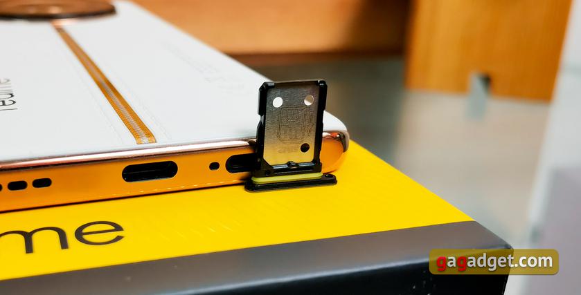 А от ззаду смартфон виглядає дуже оригінально. realme часто вдається до різних експериментів. Вже були моделі з папероподібною на дотик задньою кришкою, а тепер вирішили використати так звану еко-шркіру. Розробкою дизайну смартфона займався екс-дизайнера Gucci, Маттео Мінотто. Задня кришка світло-кремового кольору, а посередині є вертикальна золотиста полоска. Виглядає дуже цікаво і тактильні відчуття приємні. Смартфон не вислизає з долоні, а на покритті майже не залишаються сліди використання.