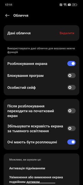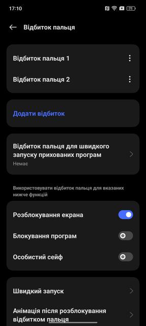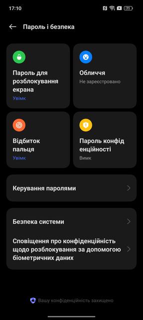 Способи розблокування цілком стандартні для сучасного смартфона: сканер відбитків пальців в екрані та розпізнавання обличчя фронтальною камерою. Сканер оптичний, тож можуть бути складнощі з розпізнаванням вологих пальців. Розташований низькувато. Але працює швидко і точно, помилок за час використання не було. Розпізнавання обличчя добре і швидко працює при достатньому освітленні. Є стандартні корисні функції: підвищення яскравості дисплея при розпізнавані у темряві, а також неможливість розблокування з закритими очима.