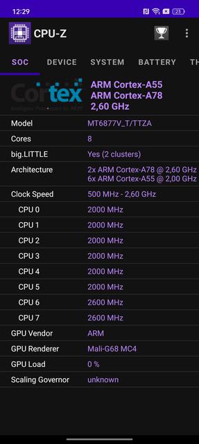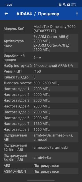 | Процесор | 64-бітний 6-нм MediaTek Dimensity 7050: 2x2.6 ГГц Cortex-A78, 6x2.0 ГГц Cortex-A55, графіка Mali-G68 MC4 | |