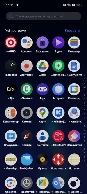 Набір фірмових програм: файловий менеджер, диктофон, калькулятор, компас, нотатки тощо.