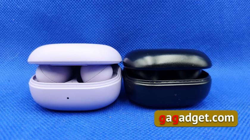 Комплект поставки традиційний і мінімалістичний — пара навушників, зарядний кейс, USB-кабель (обопільний Type-C), три комплекти амбушур різного розміру (прикольно, що вони теж фіолетового кольору) і керівництво користувача з гарантійним талоном. Сам кейс приємний на дотик, всередині матовий пластик, зовні — якийсь аналог soft touch, не надто м'який, але відрізнити від внутрішньої поверхні можна наосліп. Самі навушники теж позбавлені глянцевих поверхонь, яка постійно так мене дратує і заважає фотографуванню.