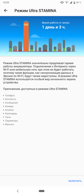 В Sony Xperia 1 встановлений акумулятор ємністю 3330 мАг. На практиці ніяких сюрпризів: день автономної роботи при дуже активному використанні. Півтора-два при більш помірних апетитах (без ігор і з невеликою кількістю фото / відео). Підтримується швидка зарядка USB Power Delivery, в комплекті відповідний БП на скромні за нинішніми мірками 18 Вт. Хоча заряджається смартфон швидко: трохи менше 2 годин до повного заряду і півгодини до 50%. Що цікаво, бездротову зарядку вирішили прибрати. Є додаткові фішки для енергозбереження Adaptive Battery (автозакриття рідко використовуваних додатків), догляд за батареєю для продовження терміну служби, режими Stamina та Digital Wellbeing: