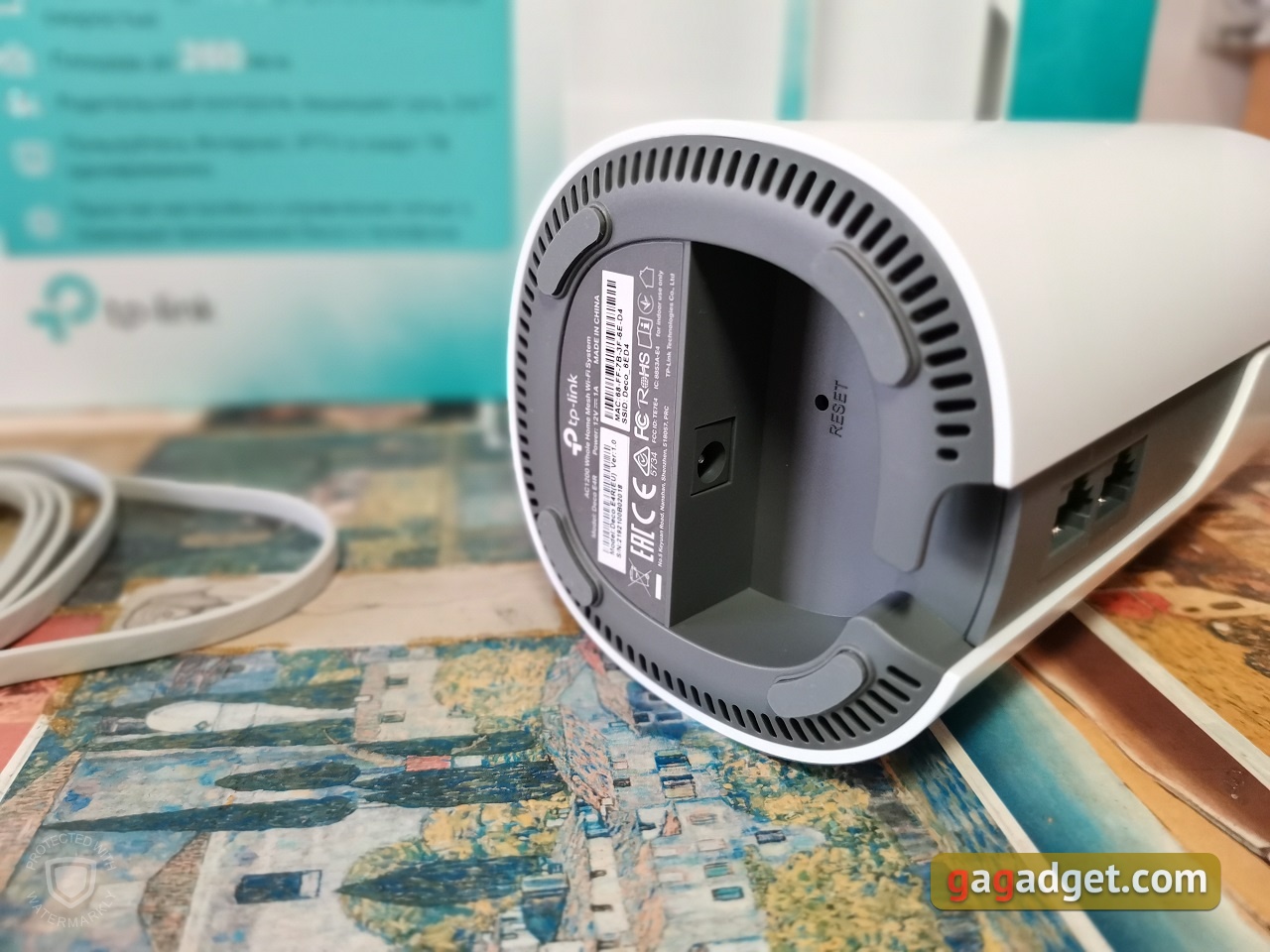 Живлення підключається позаду, причому через спеціальне заглиблення у корпусі. Таким чином ризик, що кабель десь перетисне або відключиться, якщо Deco E4 випадково зачепити, мінімальний. Пристрій продуманий навіть у таких дрібницях. Два роз'єми для підключення кабелю Ethernet знаходяться теж позаду.
