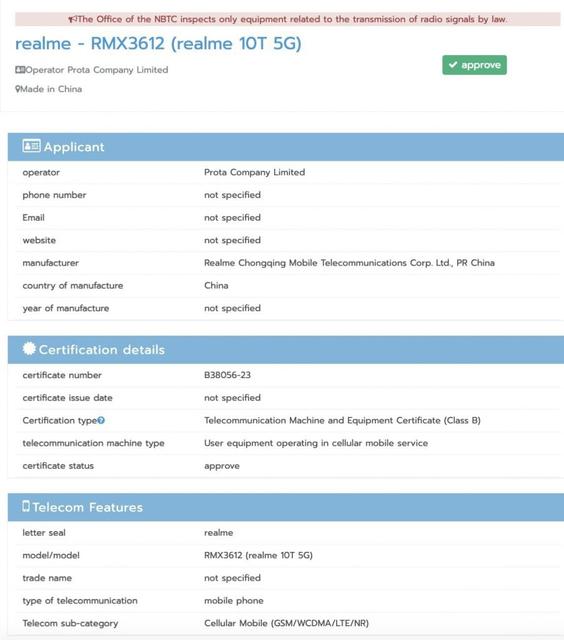 Йдеться про бюджетну модель realme 10T 5G. Смартфон пройшов сертифікацію NBTC з номером моделі RMX3612. Отже, реліз пристрою вже не за горами.