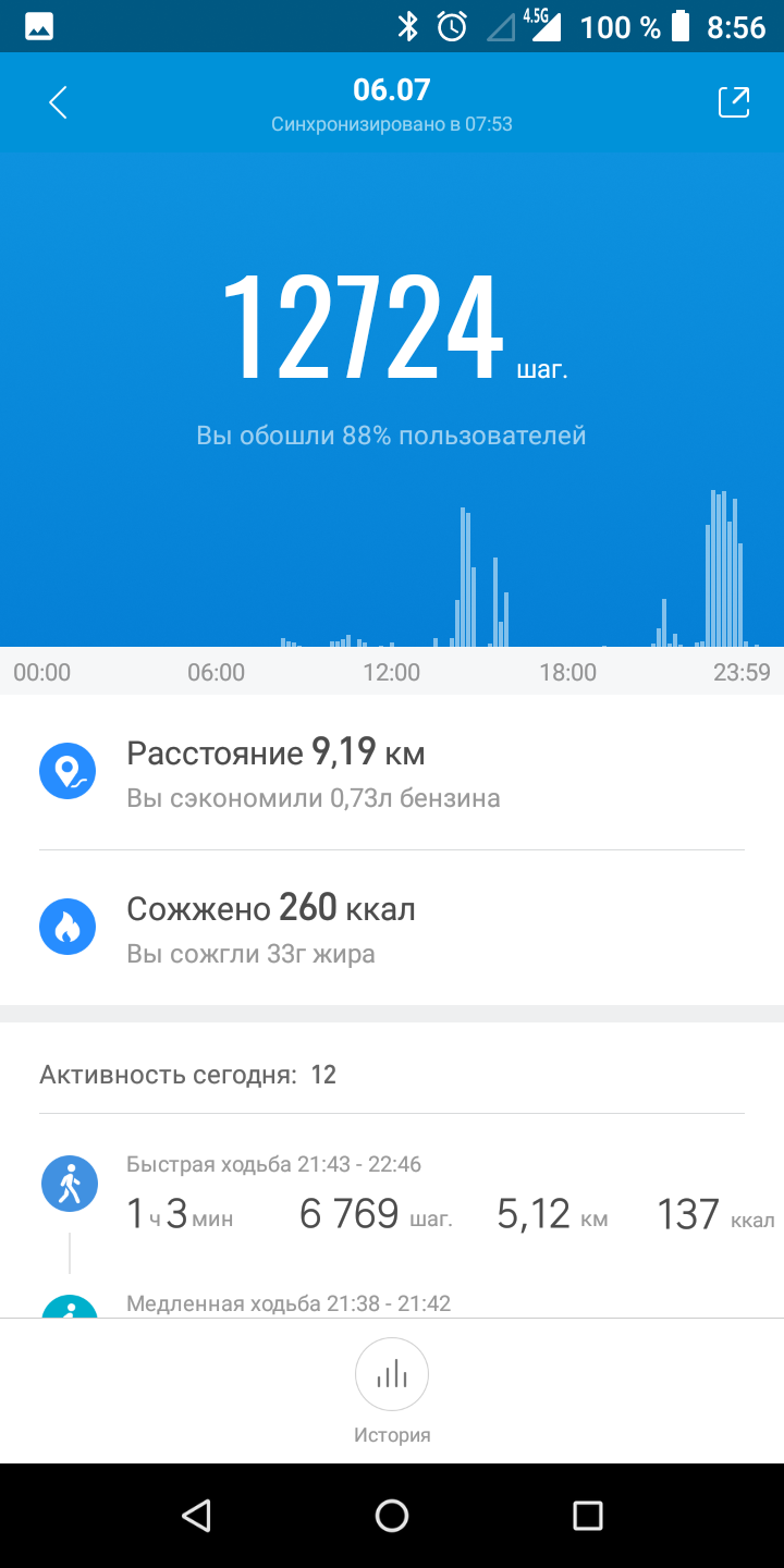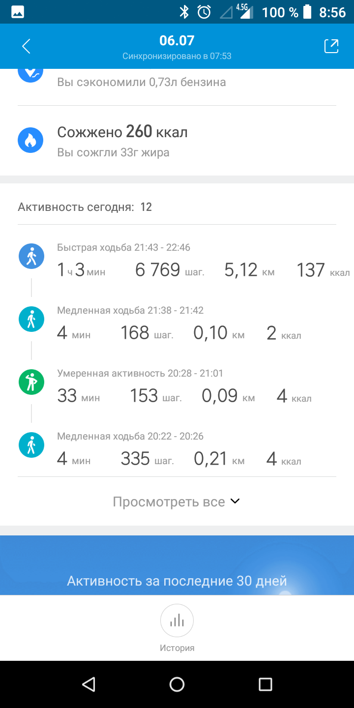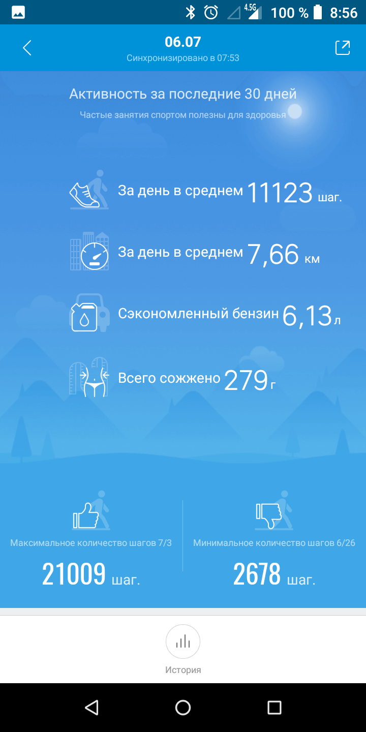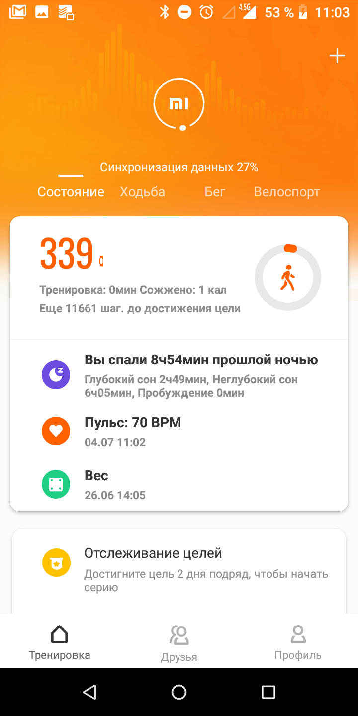 Мені здалося, що в Xiaomi не були дуже стурбовані зручною навігацією меню браслета та додатками. На шляху до режимів тренувань або перегляду зведення за день можна було б скоротити мінімум на один крок, а в додатку в розділі із загальним зведенням інформації не дуже багато, за деталями потрібно потрапити в "Мій стан" або "Мої тренування". Зате там вже є над чим подумати. У Xiaomi не стали винаходити велосипед з "корисними порадами" на підставі даних про активність та сон, все-таки гаджет й близько не медичний. Але тут є докладне порівняння зі своїми результатами в інші дні, з іншими користувачами (додає мотивації бути більш активними і лягати спати вчасно), детальна інформація про відстань, пульс та спалених калоріях в певні періоди часу. Мені сподобалося, що додаток показує, скільки бензину економить користувач завдяки ходьбі, і скільки жиру спалюється разом з калоріями. Не сподобалося, що тут, як і в більшості інших фітнес-трекерів, можна задати мету за кількістю кроків або ваги, але не за кількістю спалених калорій з активності.