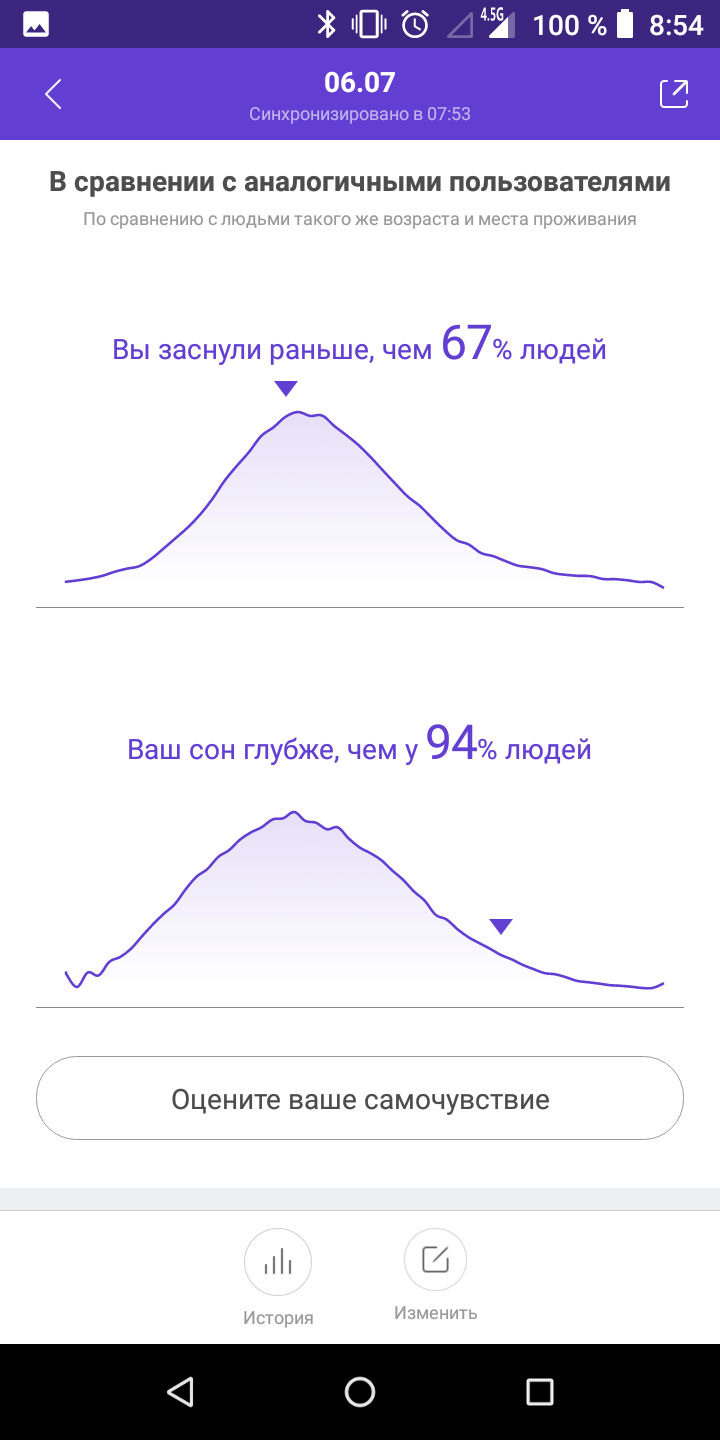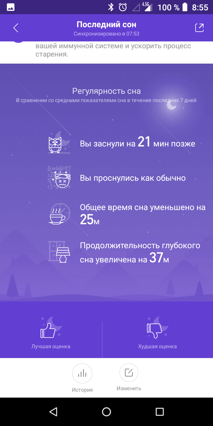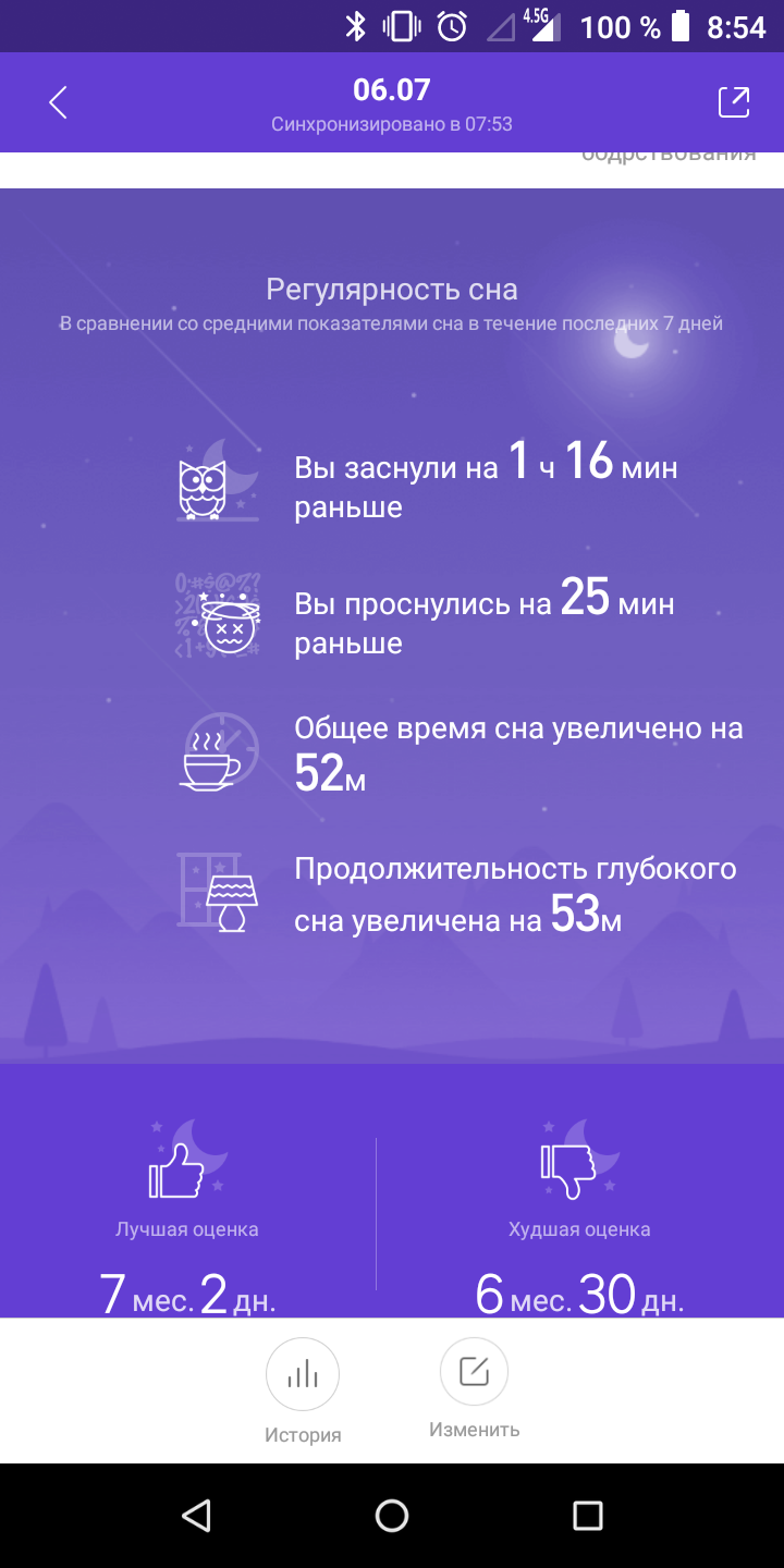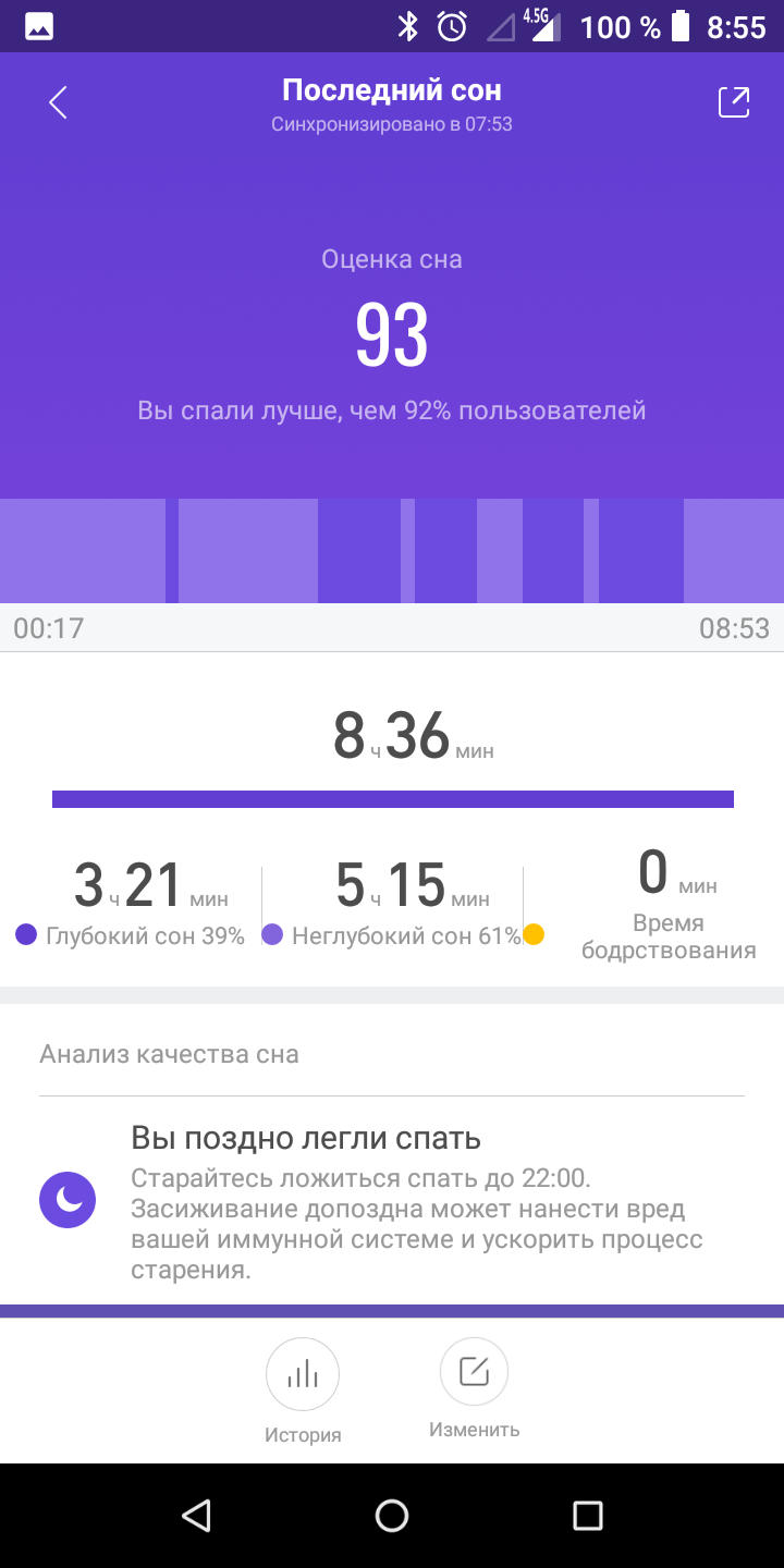 Браслет також вміє моніторити сон, але він не враховує нічні пробудження. Причому не тільки такі, коли прокидаєшся і томишся в ліжку, але і коли встаєш і щось робиш, ходиш по квартирі. При цьому на відміну від Huawei / Honor у нього немає "глибокого сну" тривалістю 10 хвилин з постійними перервами. Фази виглядають більш правдоподібно.