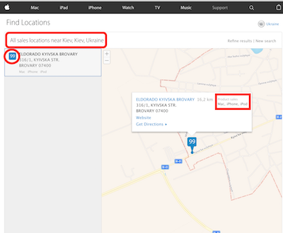 Только невежеством можно объяснить такие заявления. Официальный сайт Apple показывает 99 точек продаж в одном только Киеве. Да, это не фирменные Apple Store, но у Apple большая иерархиая точек, где можно купить что-то вполне себе официально. По ссылке картинка в полном размере