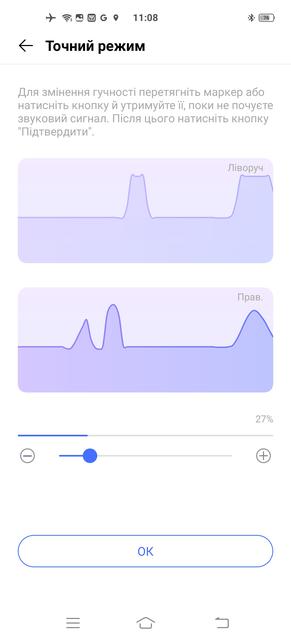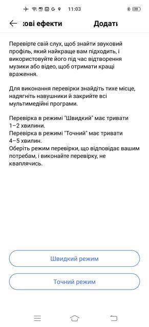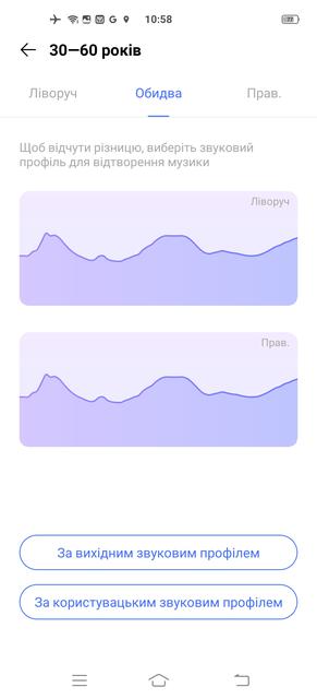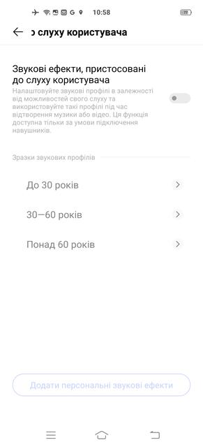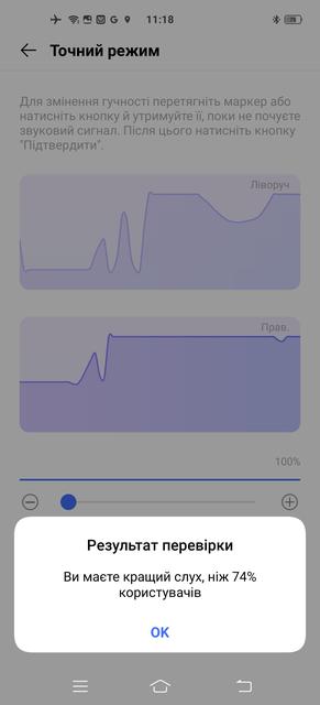 Во-вторых, здесь реализована индивидуальная настройка звука. Известно, что слух у всех разный, к тому же ухудшается с возрастом, поэтому пользователю предлагается либо выбрать один из трёх стандартных "возрастных" профилей либо пройти тест для индивидуальной настройки (обязательно в наушниках, можно и в беспроводных). После проверки моей способности слышать разные звуковые частоты смартфон выстроил для меня личный профиль эквалайзера. Результат впечатлил: до настройки звучание смартфона можно было описать словами "ничего особенного", звук был немного ватным, приглушенным. После настройки звук стал более ярким и детальным – за счет подъема уровня высоких частот, которые с возрастом (мне 48) воспринимаются слабее. С первого раза получился даже перебор, вторая попытка оказалась удачнее, и мои любимые Pentatonix зазвучали как положено. Так что если не понравился результат - стоит попробовать еще раз.